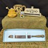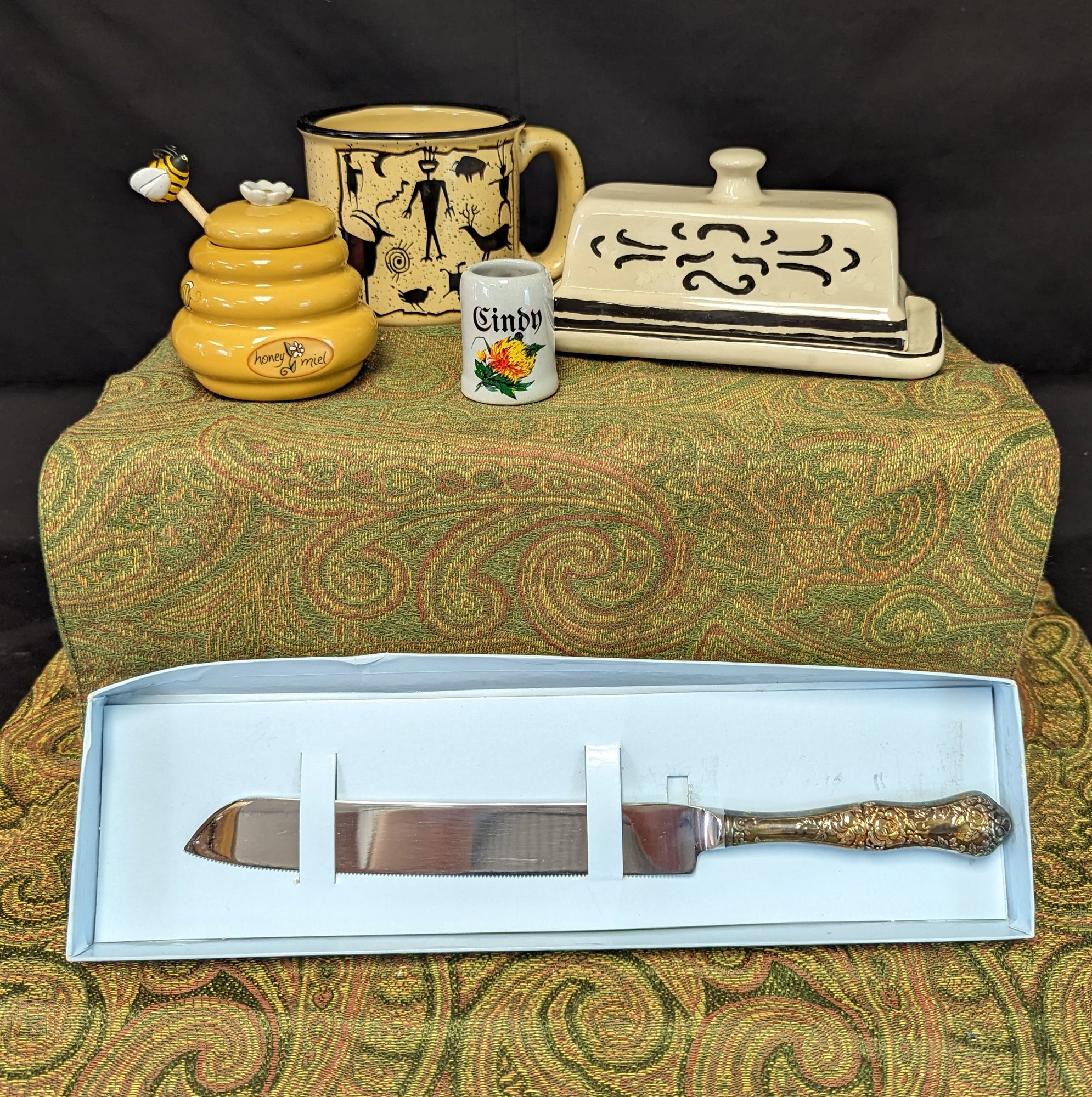 5 piece kitchenware set. Knife has minor ware- 12" long floral handle. Butter dish is 7" long. Shot glass is 2" talk with wax residue inside, honey pot with wand is 3.5" tall same with mug
