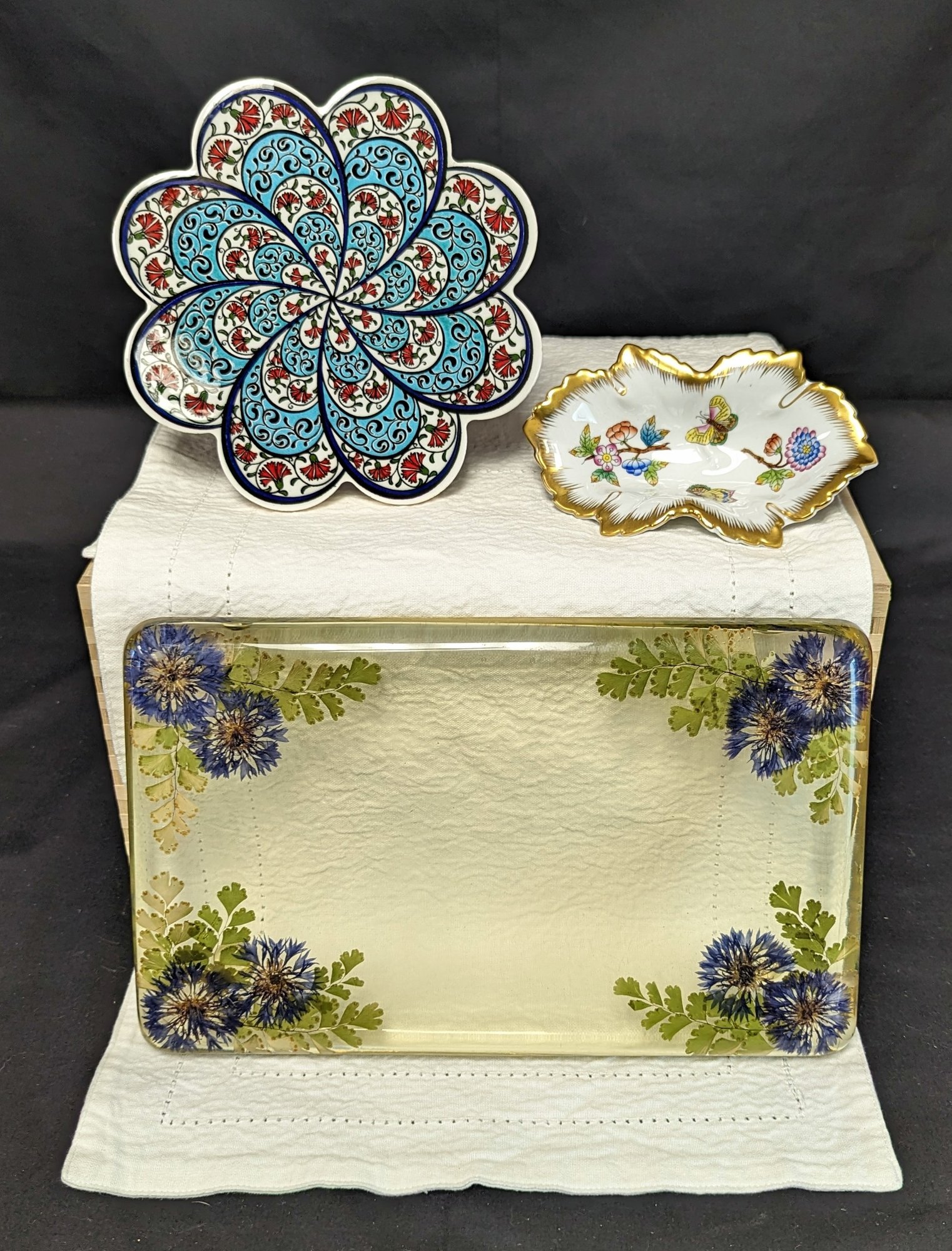Tray 11.5"x7" , floral tray 7.25" diameter, dish is 6" long