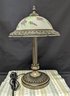 Ornate floral detailed lamp brass in color of hardware- not material. Lamp shade is glass with hand painted purple flowers. Lamp was tested and does work
