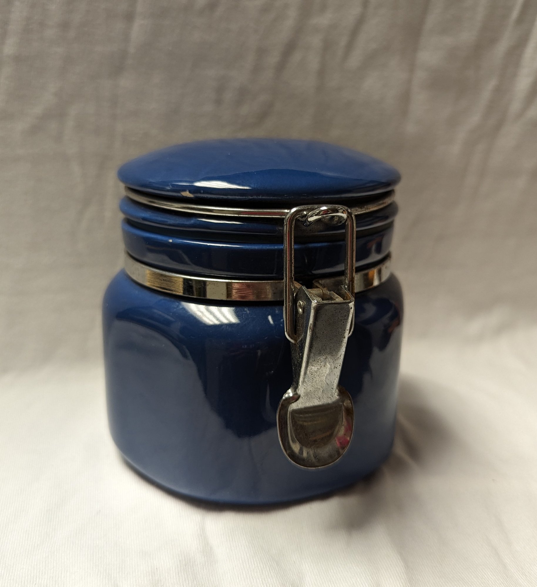 Royal blue kitchenware sealed jar. Mild rust on seal + metal clasp components. Seal works perfectly. 2 minor chips included in pictures.