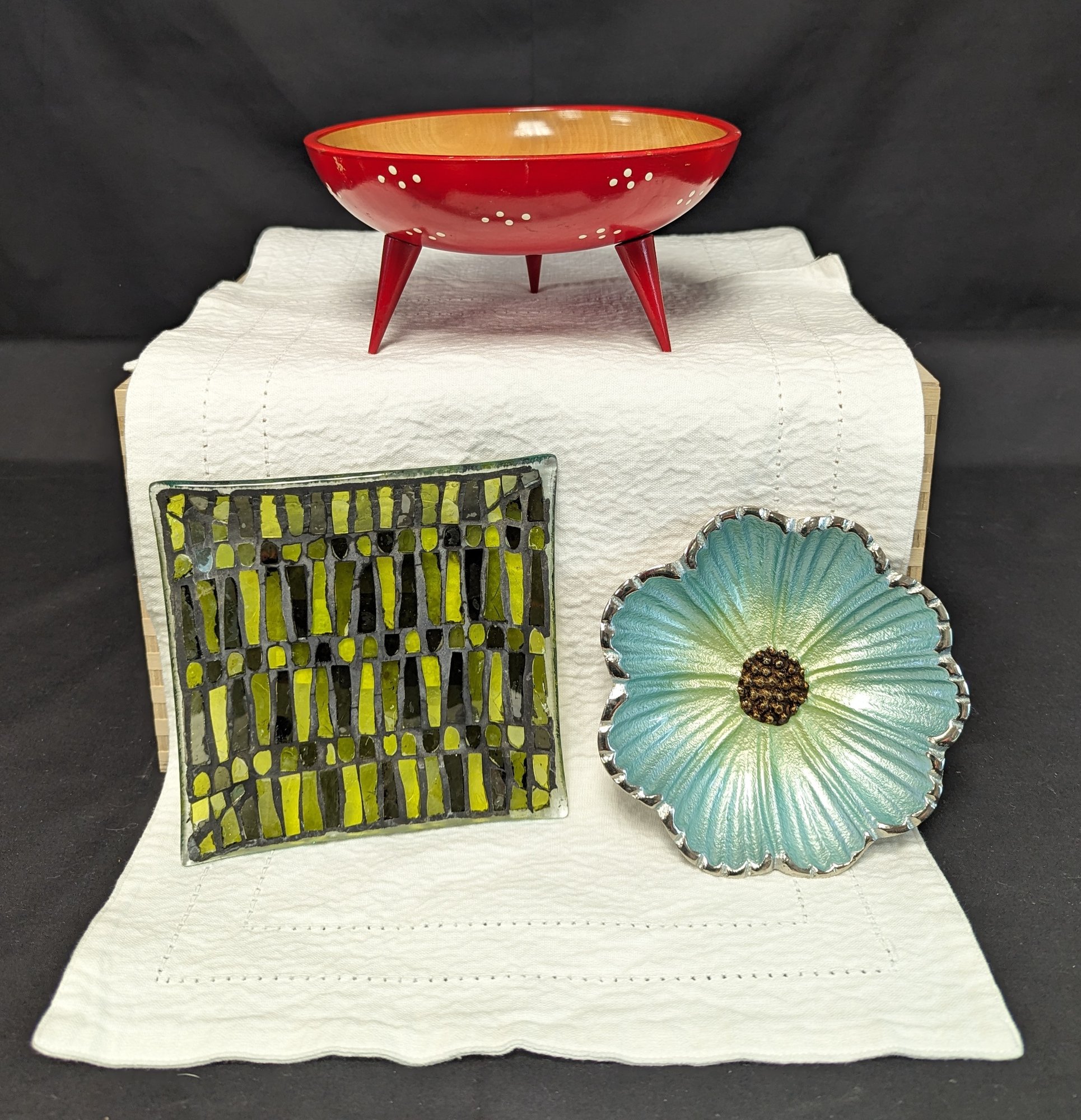 Set of three different trinket dishes, red bowl has slight discoloration inside the bowl, 7" diameter. Green square dish has some cracks in glass, 6"x6". Flower dish is in great shape about 5" diameter.