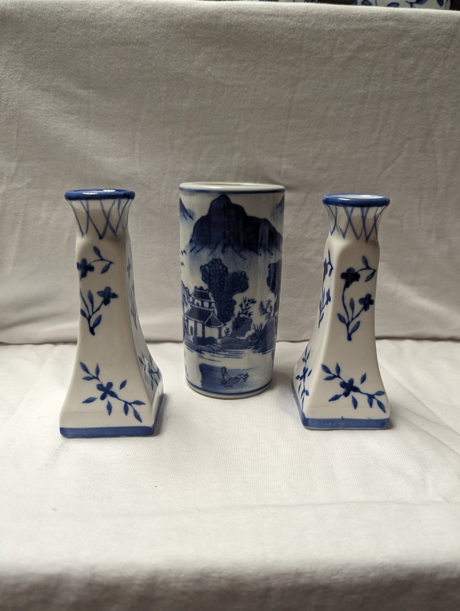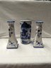 Set of 3 ceramic tableware pieces. 2 candle holders, one small vase. All with floral and Asian details. Blue and white