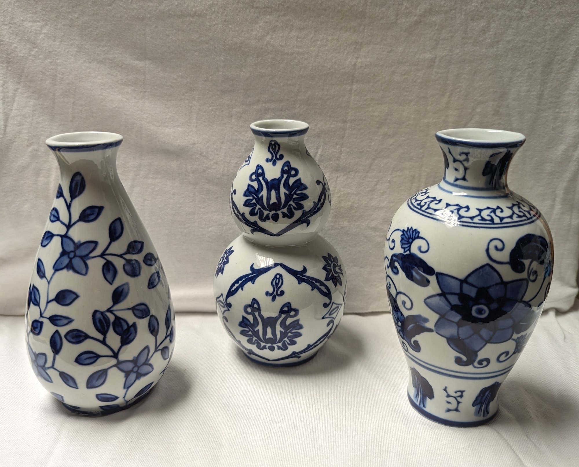 Set of 3 ceramic blue ornate floral pattern. In great condition, minor ware on the bottoms of each vase. The Bombay Company.
