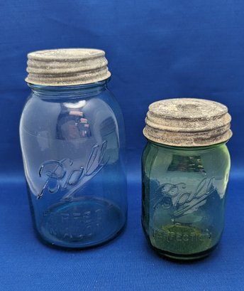 one blue and one green glass ball jars with lids