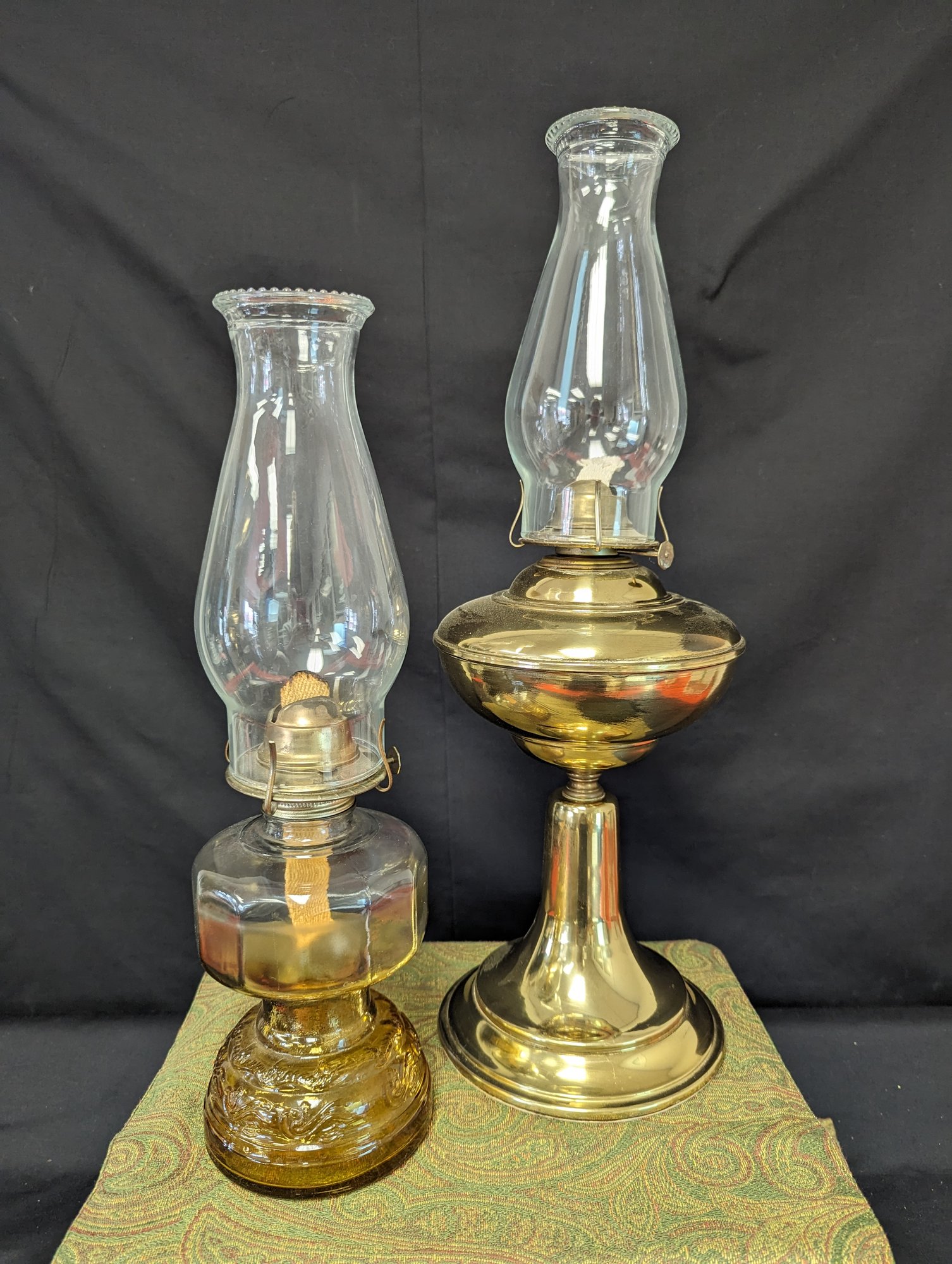 Set of two oil lamps with glass. Gold hardware on the taller lamp- many scratches and discoloration - see pictures. With glass lamp is 20.5" tall without 13.5" second lamp has floral detail on glass base, moderate ware with glass lamp is 16.5" tall without 9.5"