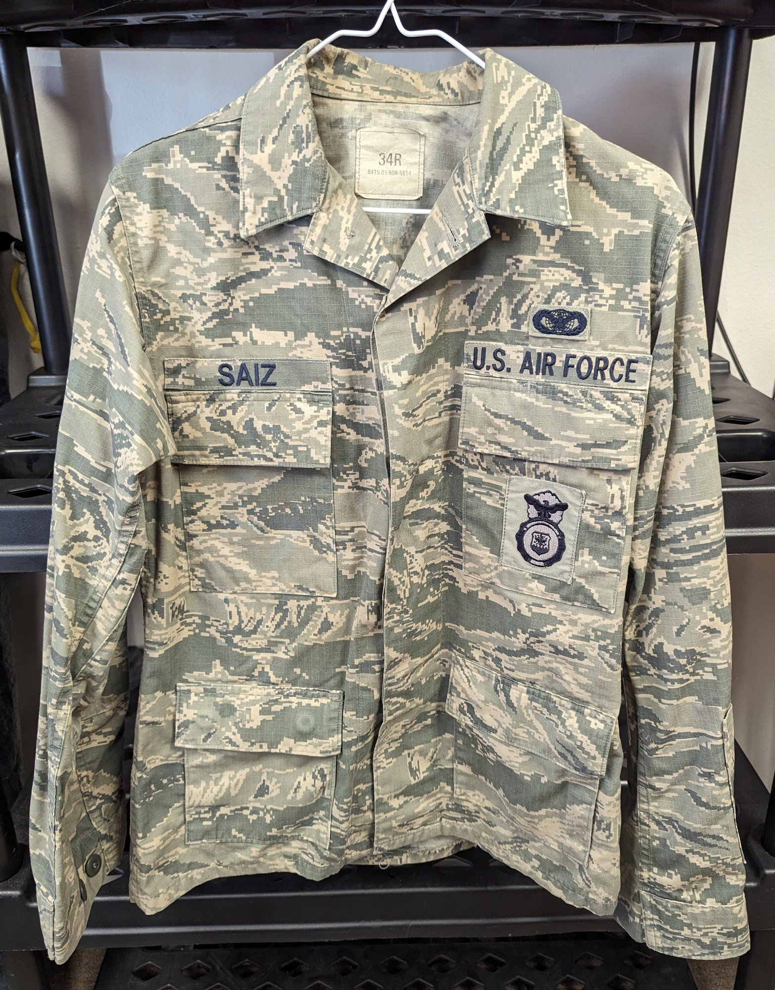United States Air Force uniform, 'Saiz', 34R, no size on pants. All buttons intact with belt. Patches on both upper arms. Some stains on neck of jacket