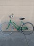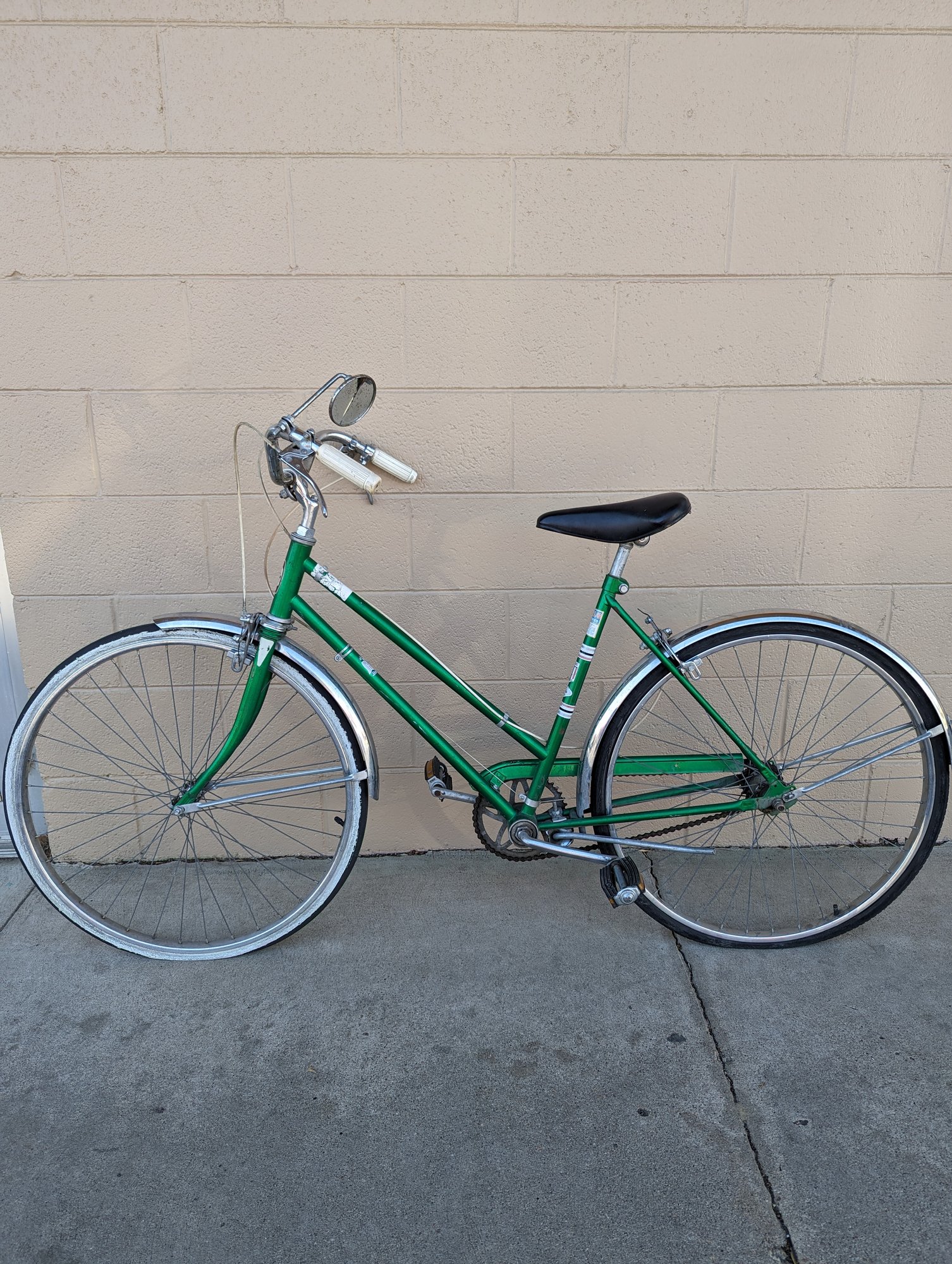 Vintage huffy green bicycle. Original tires- need replacing. Seat needs to be replaced. Has kickstand. Ware and rust- see pictures. BMA/6 certified front handbrakes and mirror on handlebars -cracked