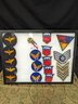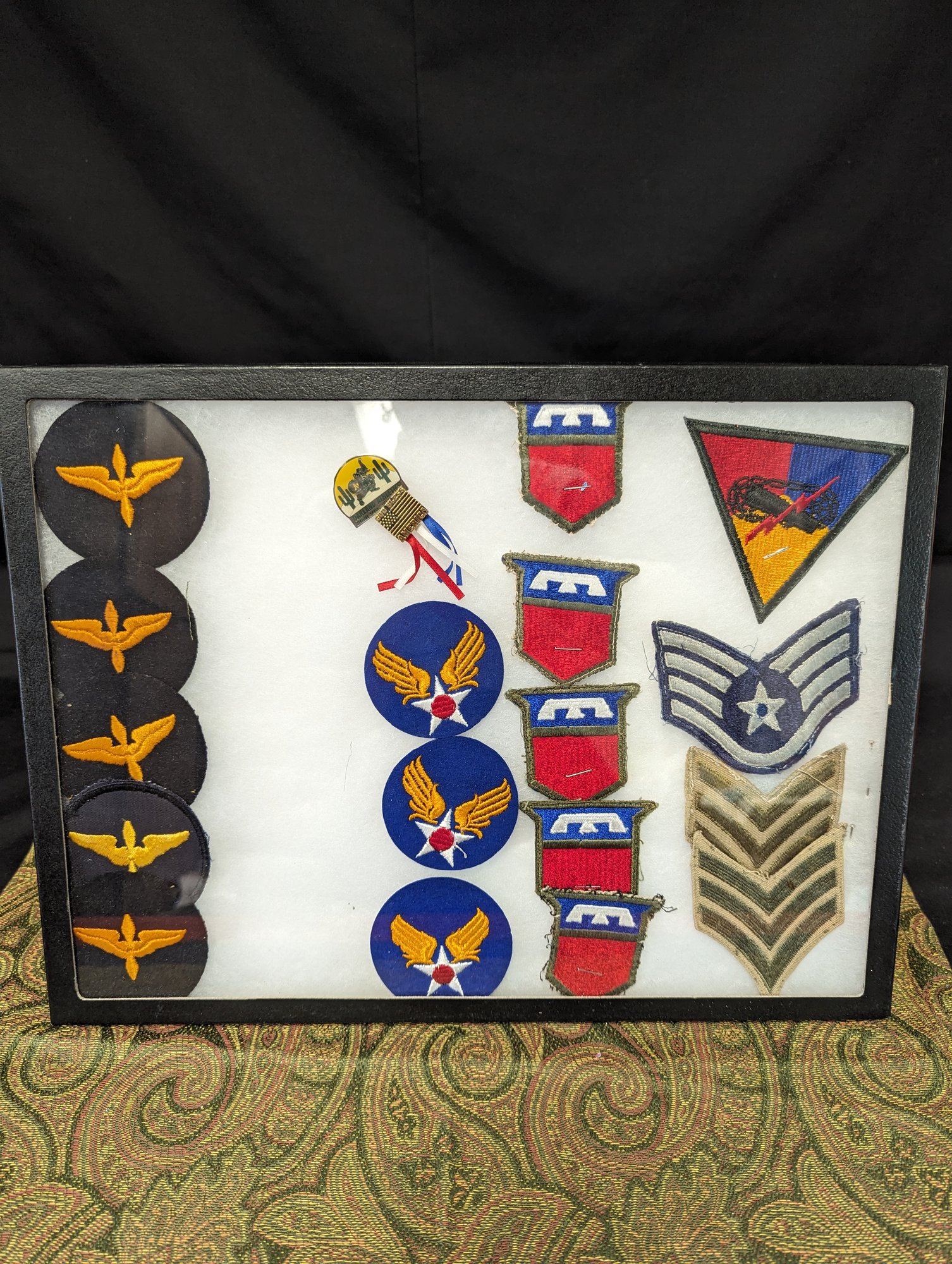 Vintage military patches in frame- about 16" x12.5" dragon patch as well- 8"diameter frame has some ware on it but overall in great shape