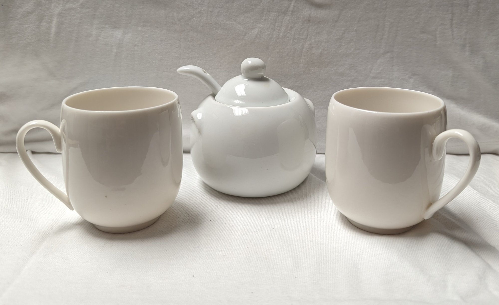 Two tea cups, one sugar or condiment holder with spoon. Ceramic, white, in pristine condition
