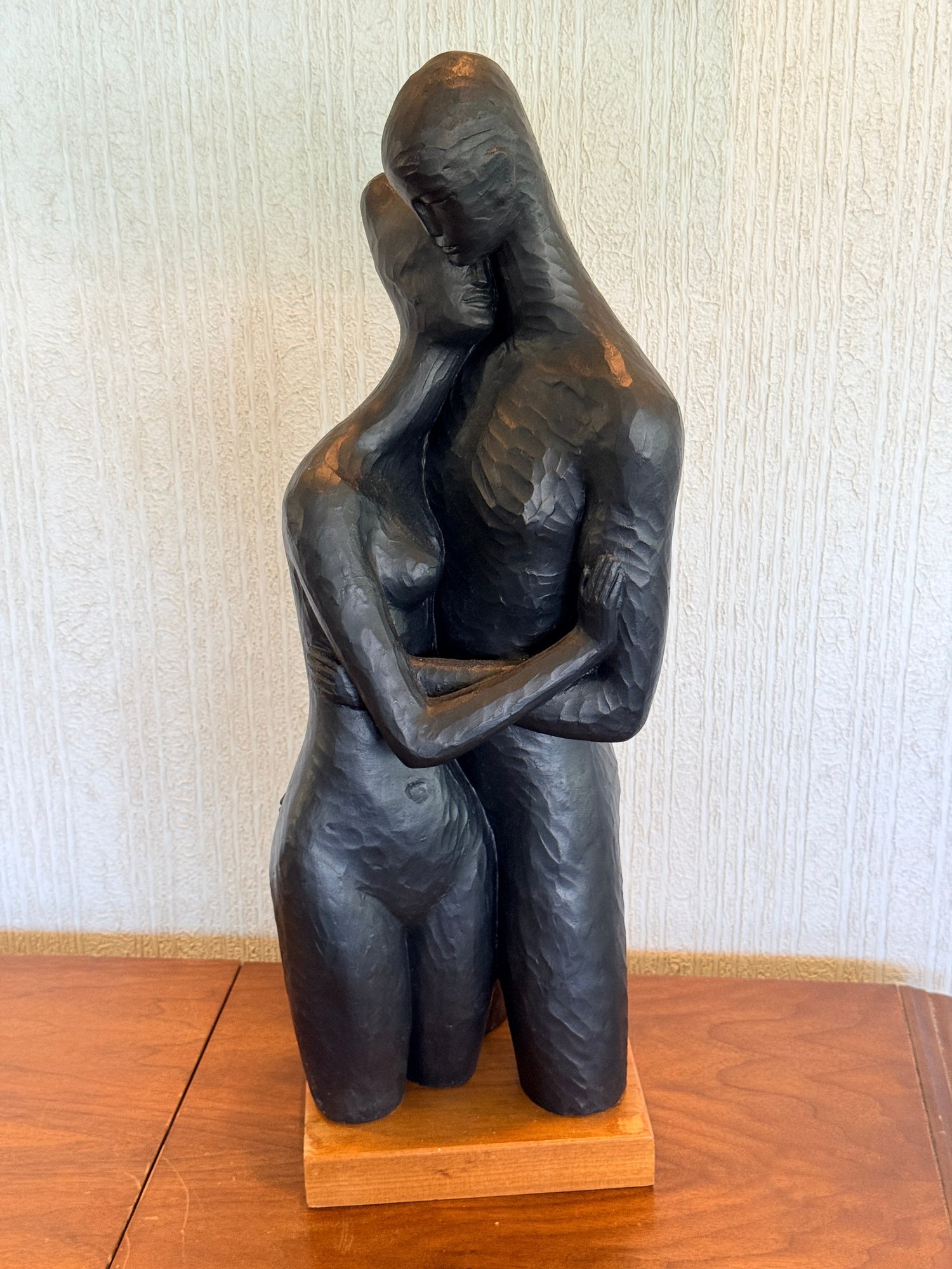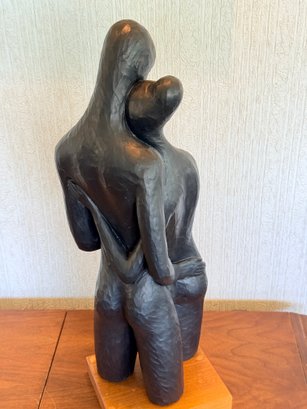 1968 Mid-Century "Embracing" abstract sculpture by Austin Productions. It features a carved, dark-finished abstract couple standing on a wooden base.