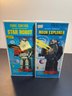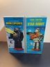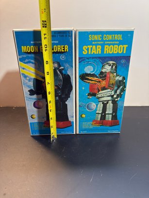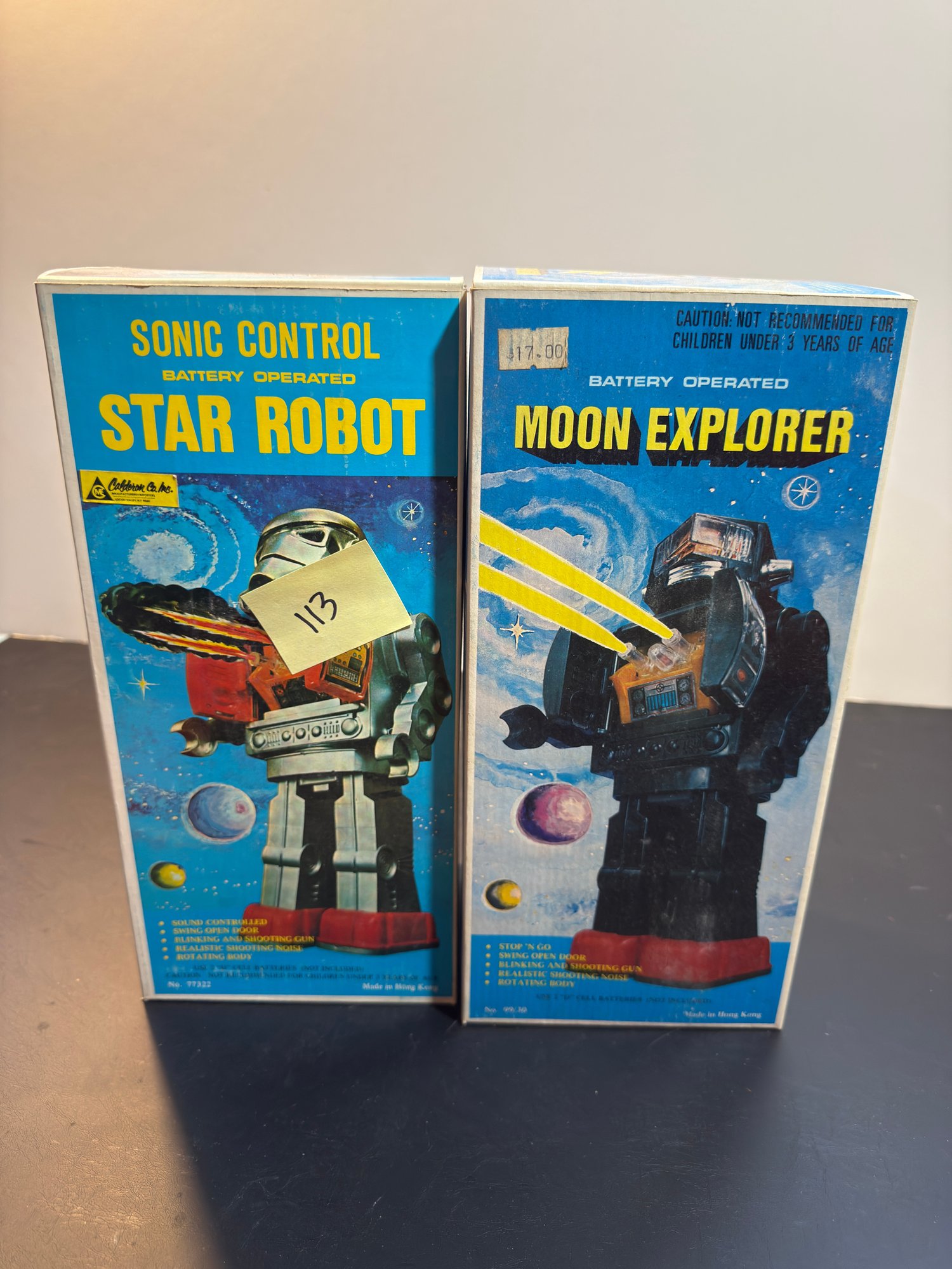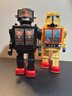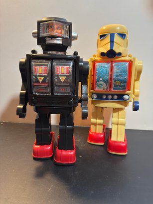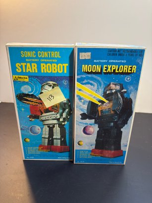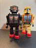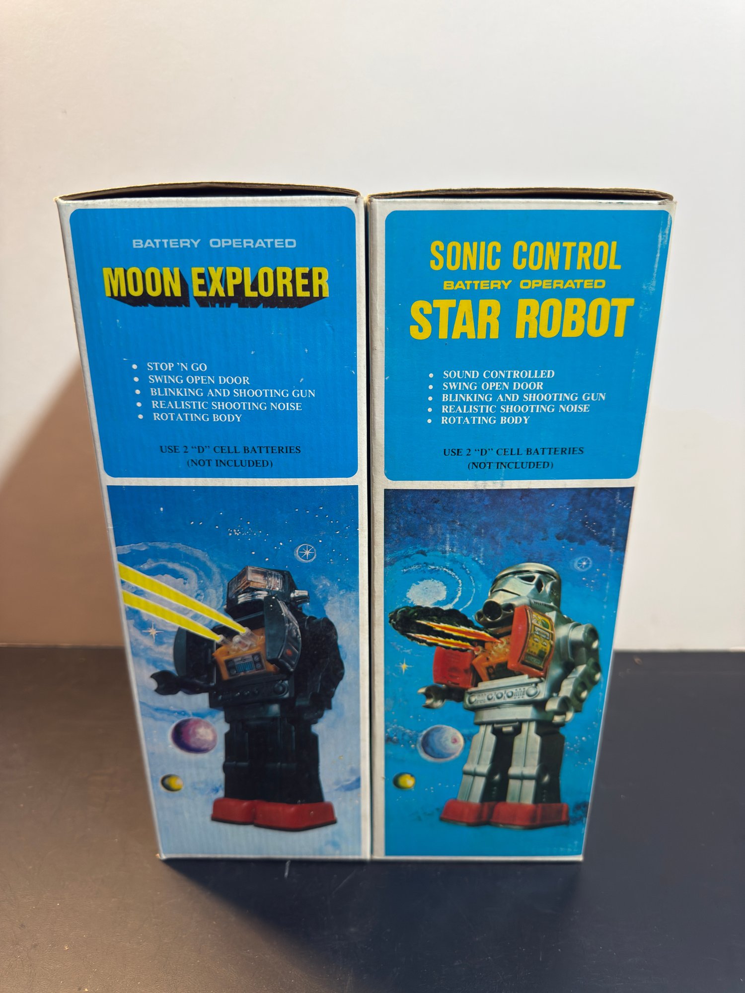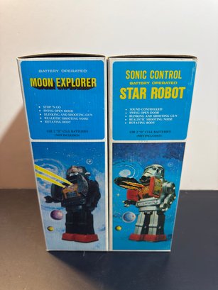 Black Robot (Left): This is a Moon Explorer Robot or Spaceman Astronaut, often attributed to the brand Amico (circa 1979). It features a clear faceplate revealing a human astronaut face. Similar designs were also produced by Horikawa in Japan during the 1960s and 70s as part of their "Rotate-O-Matic" series.