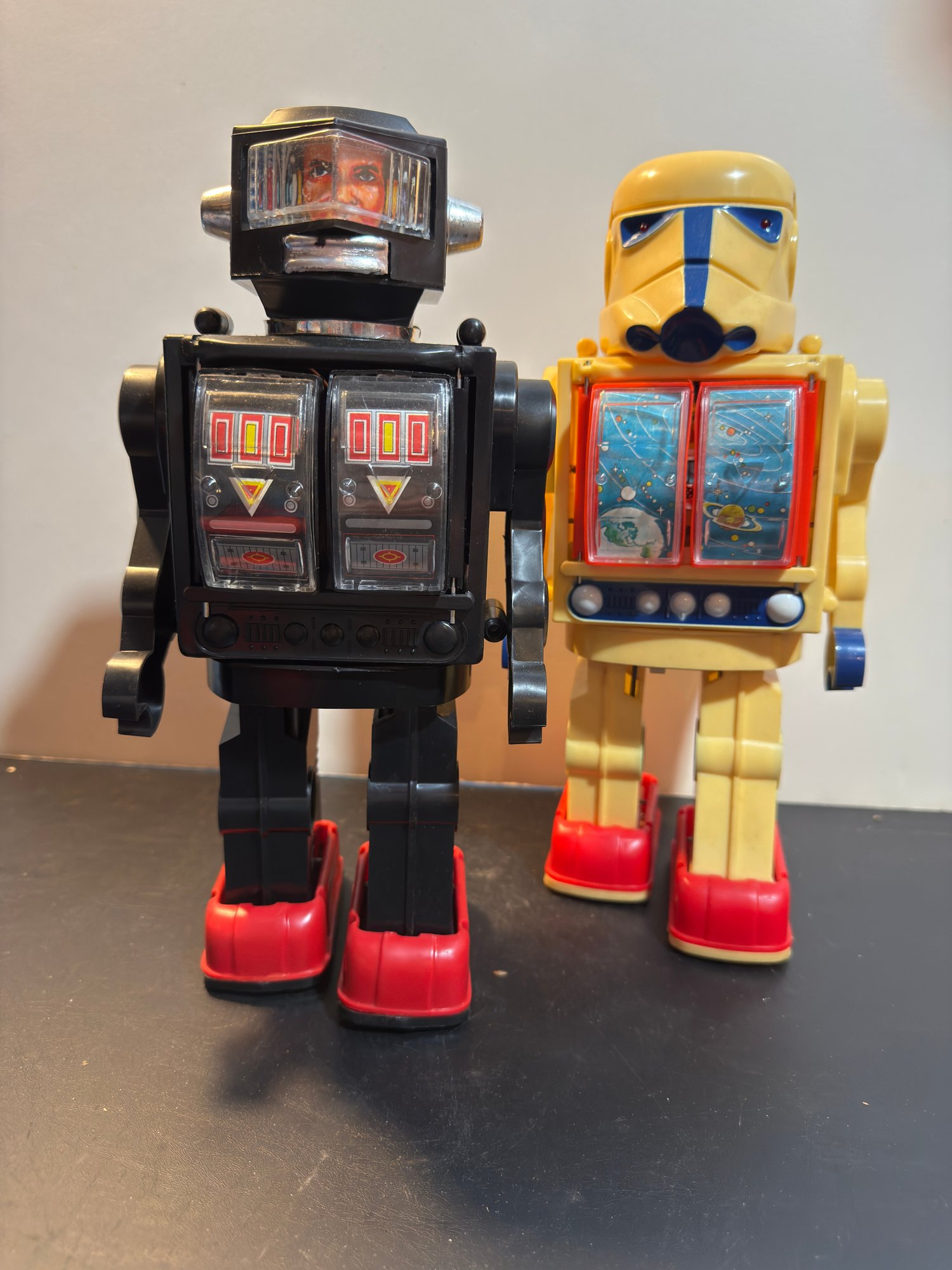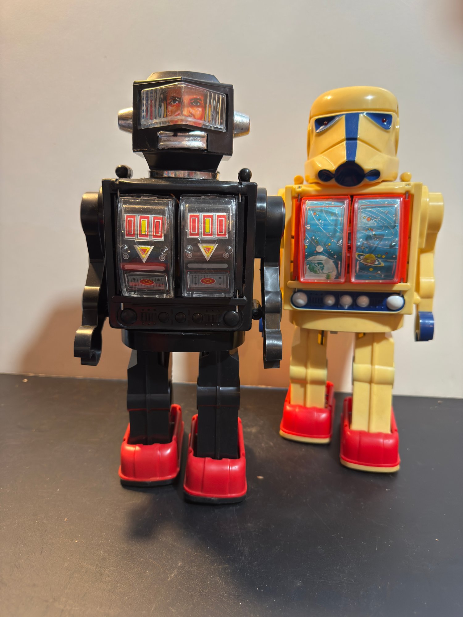 Yellow Robot (Right): This is a Star Robot, a vintage 1970s "knockoff" or "inspired" toy made in Hong Kong that closely resembles a Star Wars Stormtrooper. It features a head sculpt similar to a Stormtrooper helmet and characteristic dual chest panels.