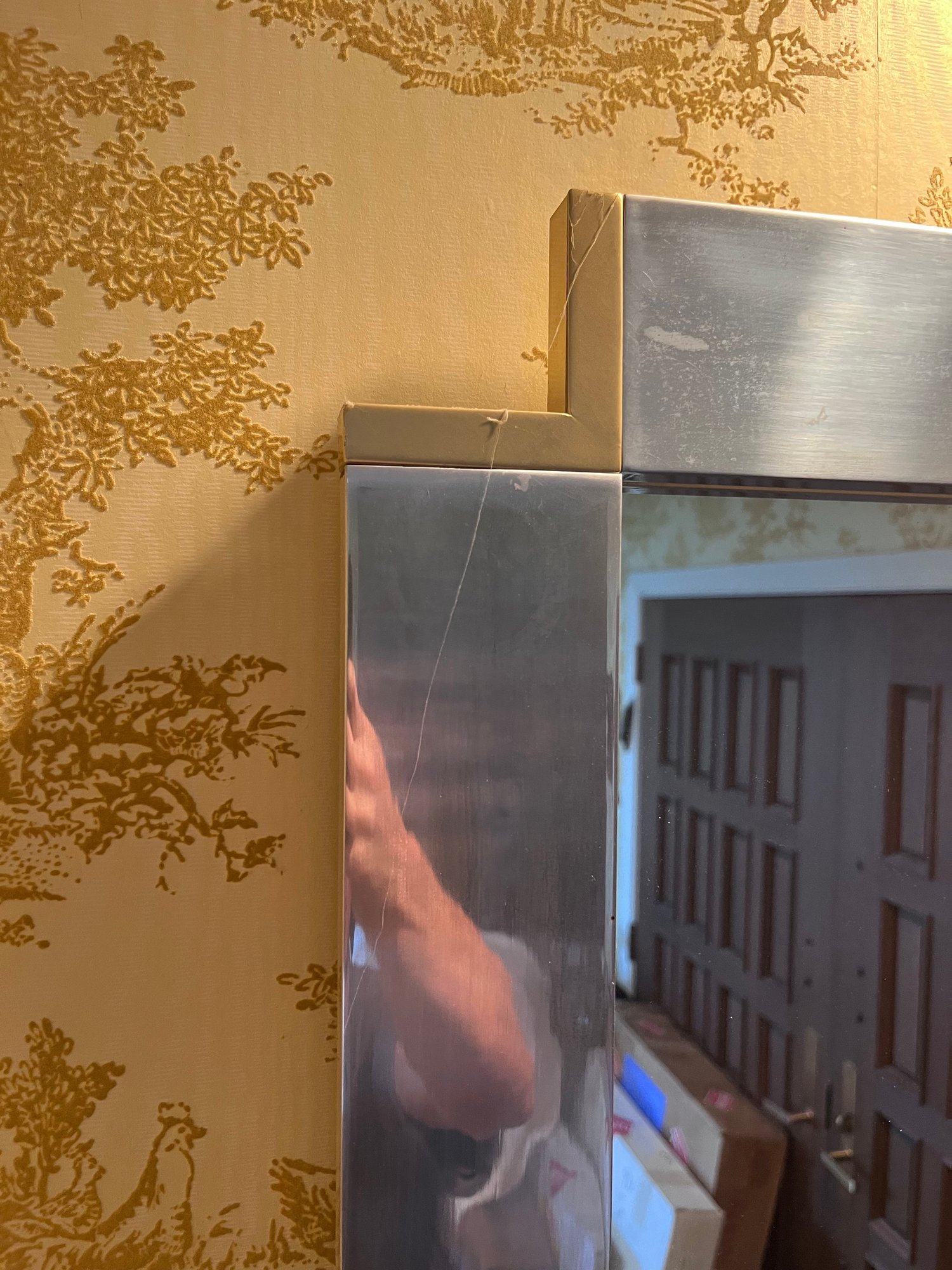 • Materials: Mirror glass center with mirrored or smoked acrylic / laminate / metal-clad wood frame