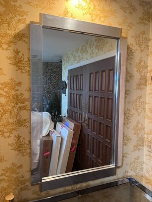 1970s–1980s contemporary / Hollywood Regency style oversized wall mirror, with strong Art Deco influence. The stepped corners, polished smoked/chrome-like mirrored frame, and bold geometric profile are classic upscale design cues from that era.