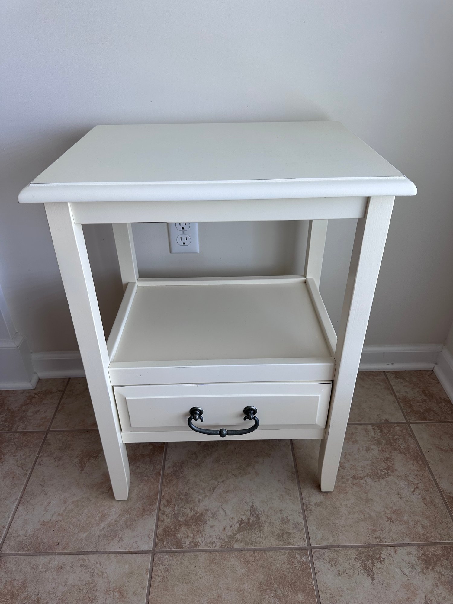 Farmhouse style white accent table is 20 inches wide, 16 inches deep in 27 inches high.