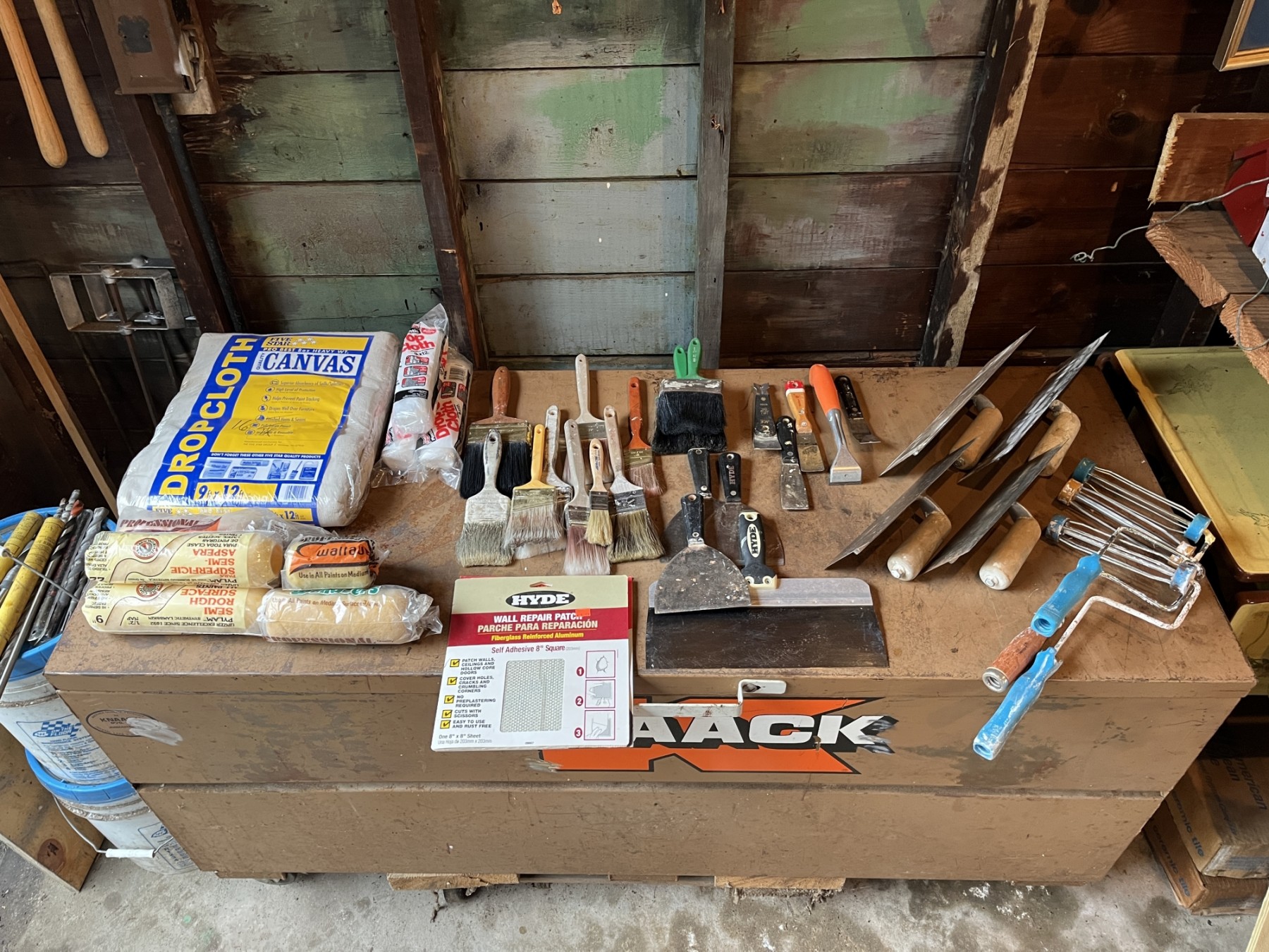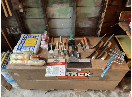 Brand new rollers, Brand New 9 x 12’ canvas drop cloth, 3 plastic drop cloths 9x12, Paint brushes, wall repair, various putty knives, rollers, etc. Everything you need for your next painting project. Perfect for home or commercial use.