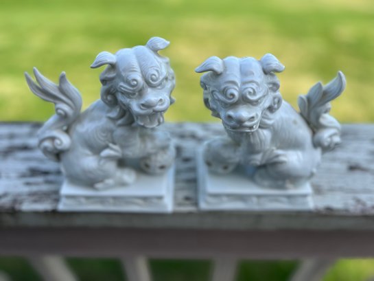 Pair of Chinese-style white porcelain foo dog figurines, often used as decorative guardian statues. These specific pieces are approximately 6 inches tall and were sold at auction with dimensions of 6x4.5x3 inches. They feature intricate detailing and a glossy finish.