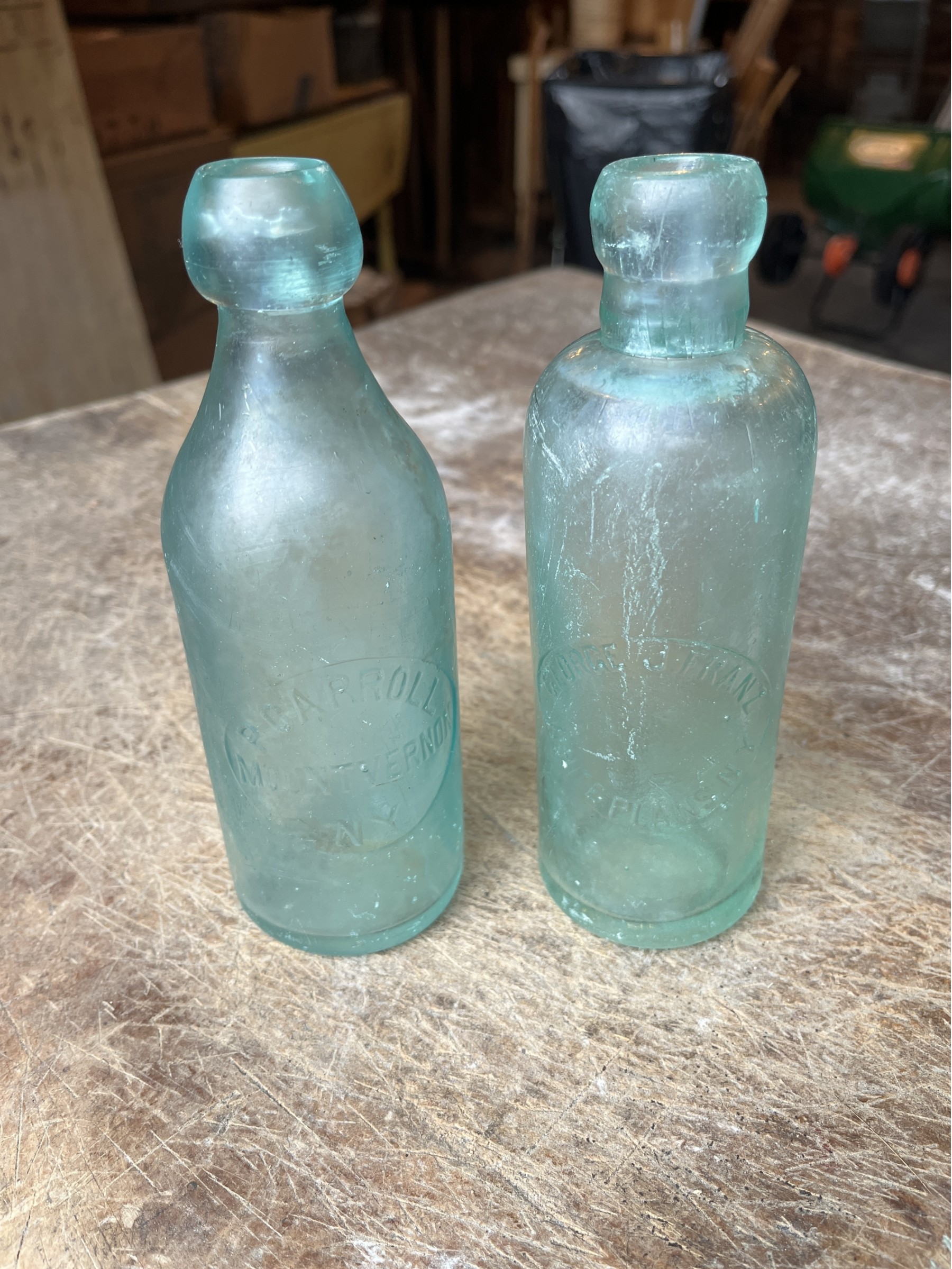Lightly colored bluish green decorative glass bottles. One bottle reads “P Carroll Mount Vernon New York” And the other reads “George J Franz White Plains New York” Both bottles have normal wear and tear and some light staining. One of the bottles has a minor chip near the top.