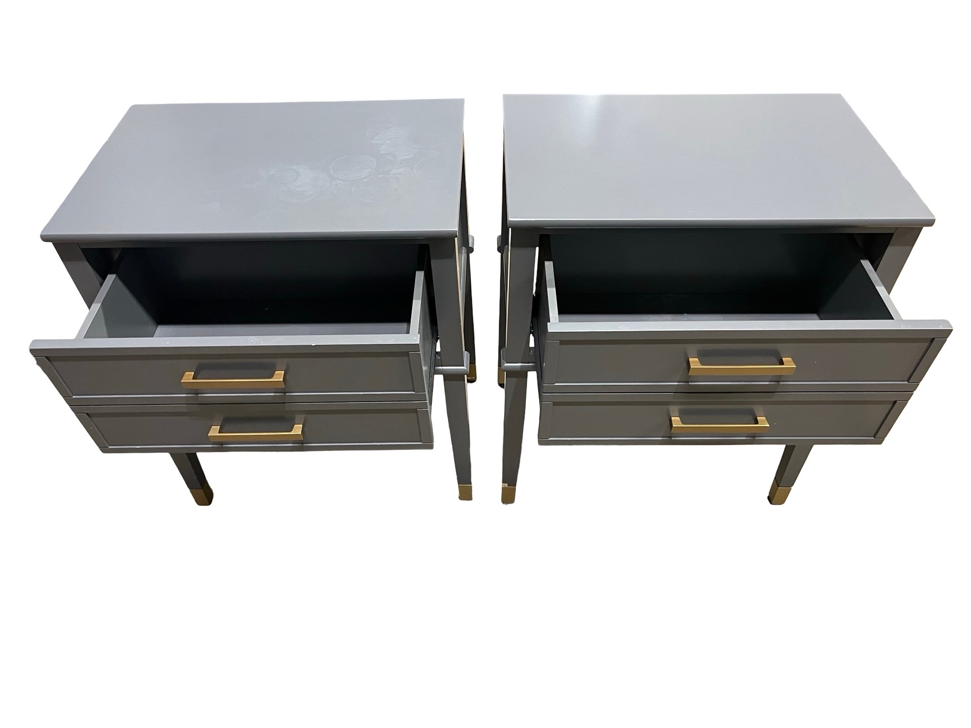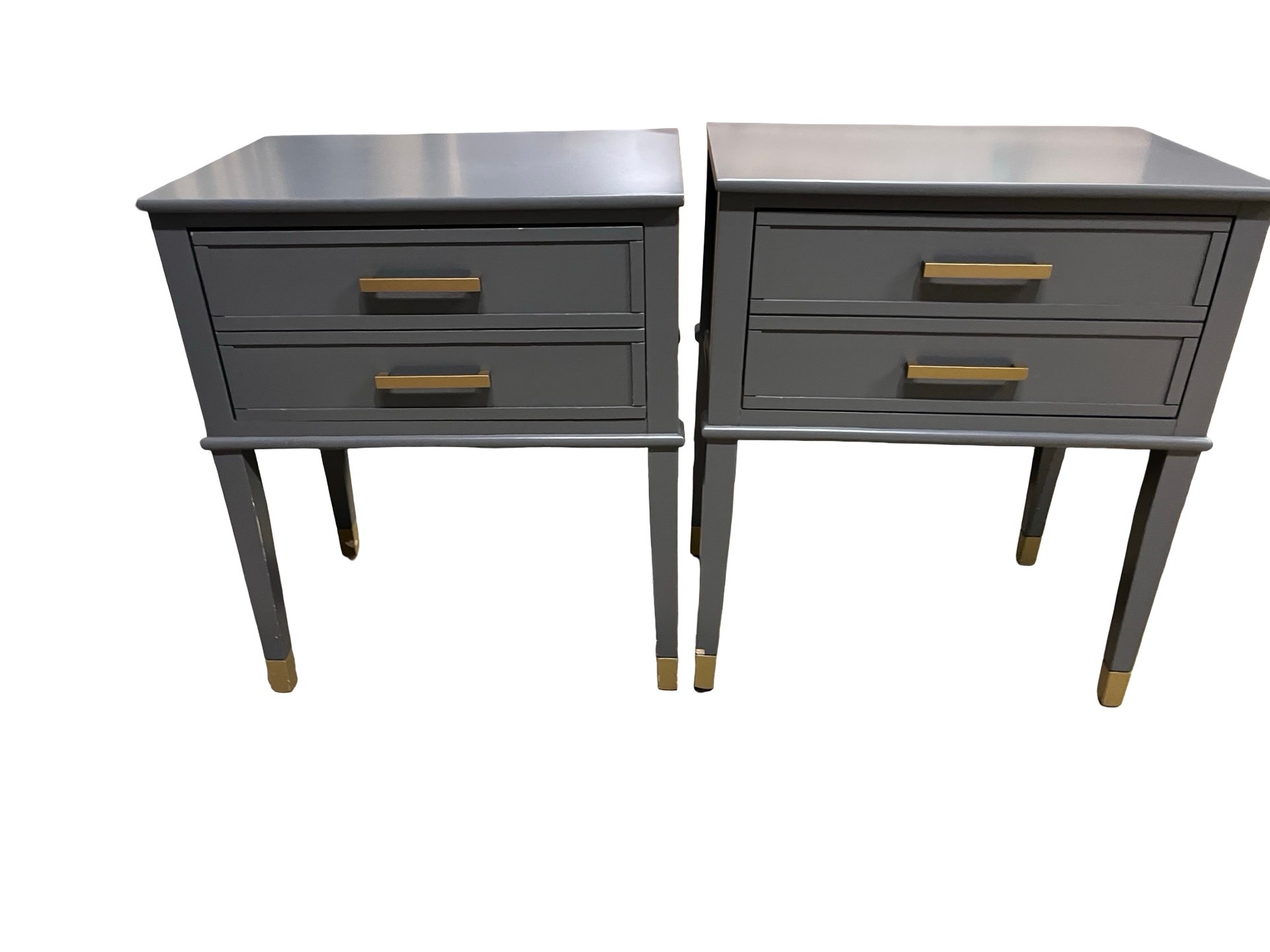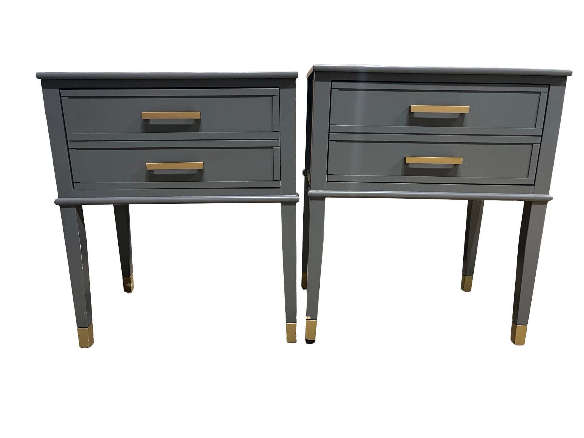 The tables are accented with vintage gold drawer pulls and painted gold "dip" feet. It is constructed from a mix of engineered wood (MDF) and wood veneer.