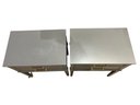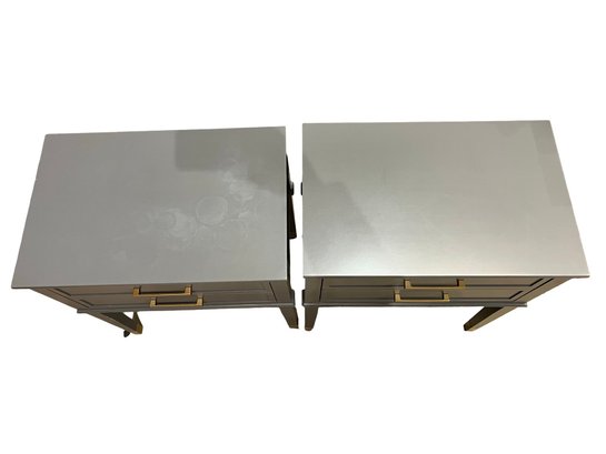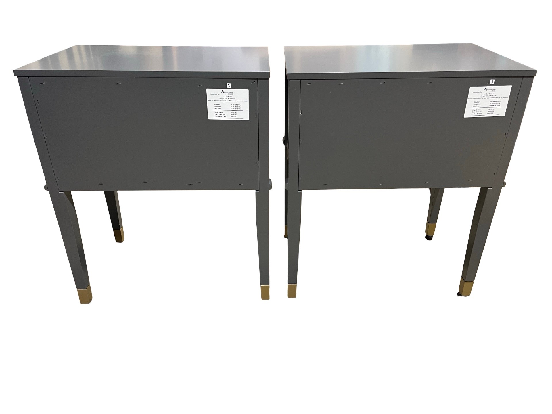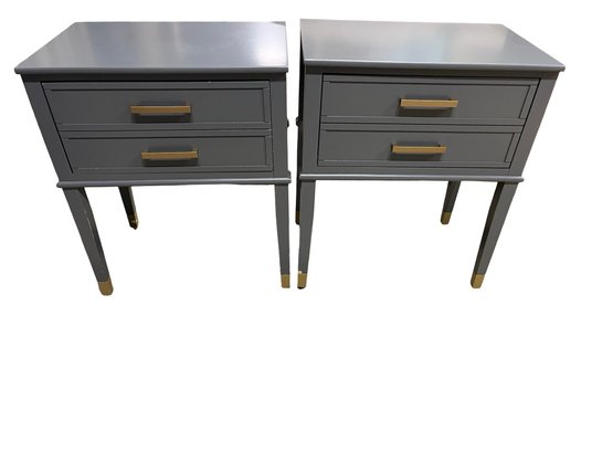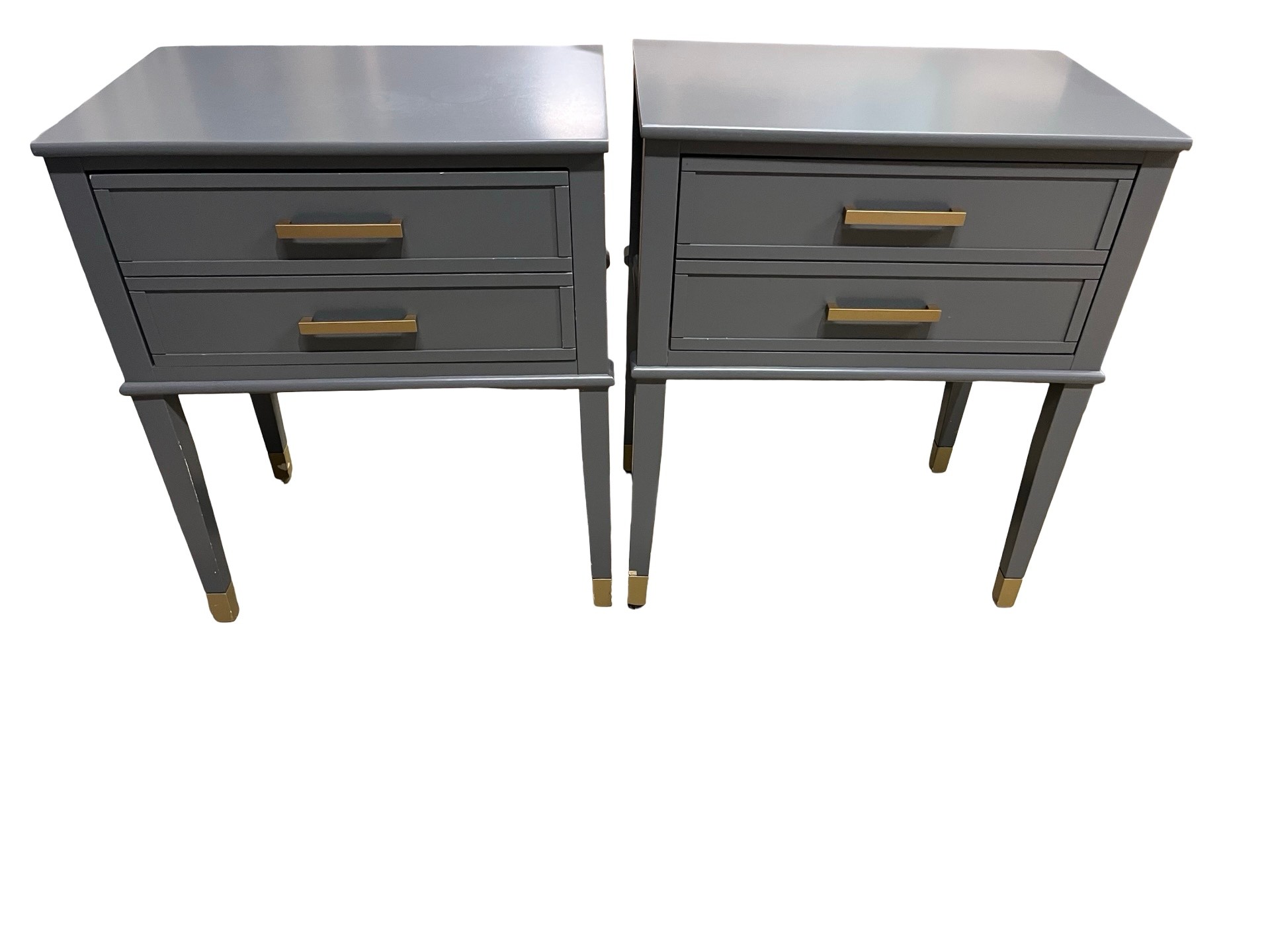 The tables are accented with vintage gold drawer pulls and painted gold "dip" feet. It is constructed from a mix of engineered wood (MDF) and wood veneer.
