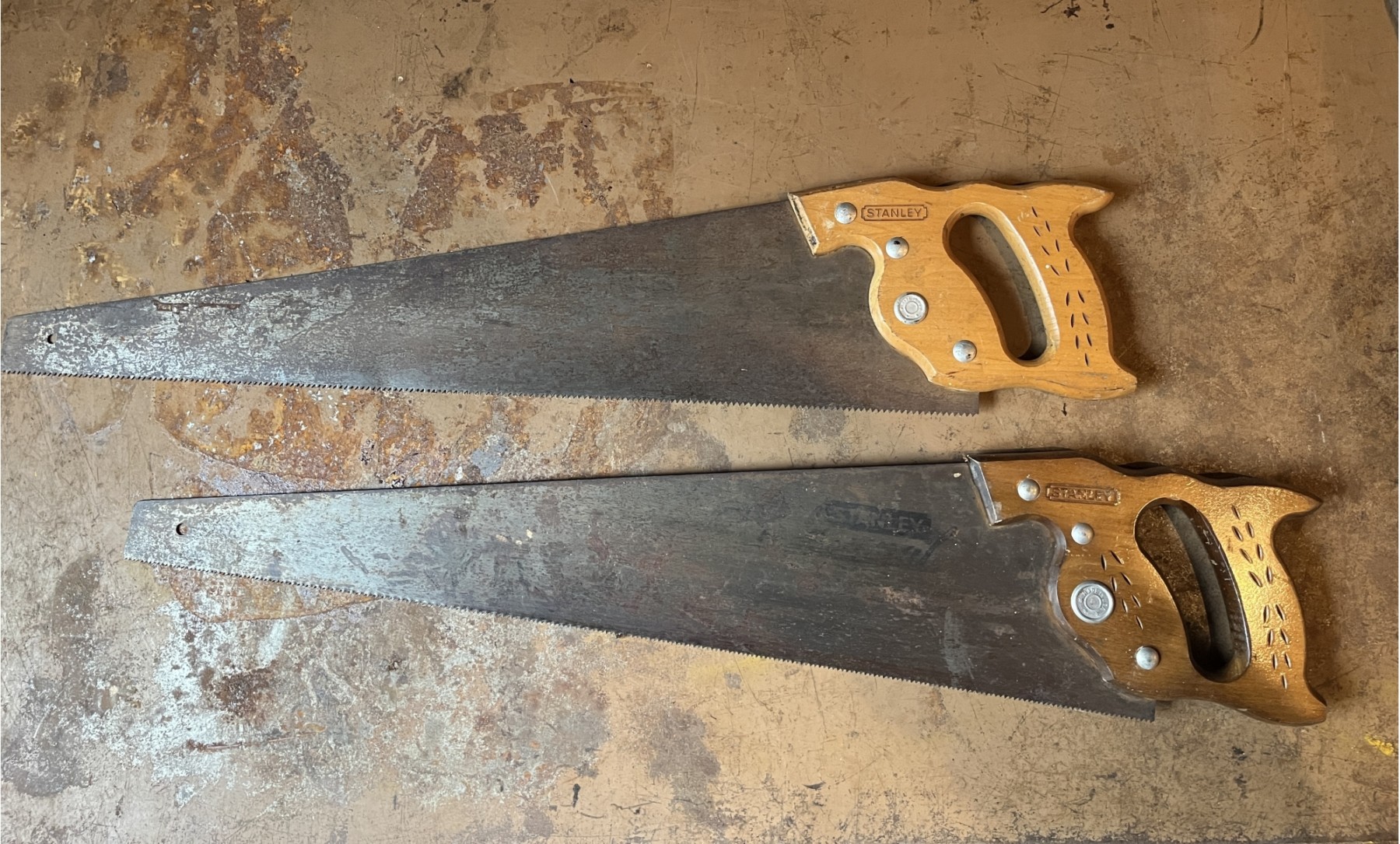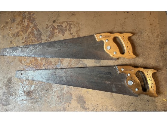 Pair of 26” long vintage Stanley hand saws. Both in good condition, no cracks on wood handles.