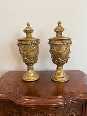 Neoclassical gilt-carved urns. Neoclassical style characterized by symmetrical design and classical motifs. Gilt-carved finished with a gold coating. Features a decorative garland and ornate base, with a removable lid. Primarily decorative, suitable for display on a table or floor.