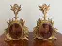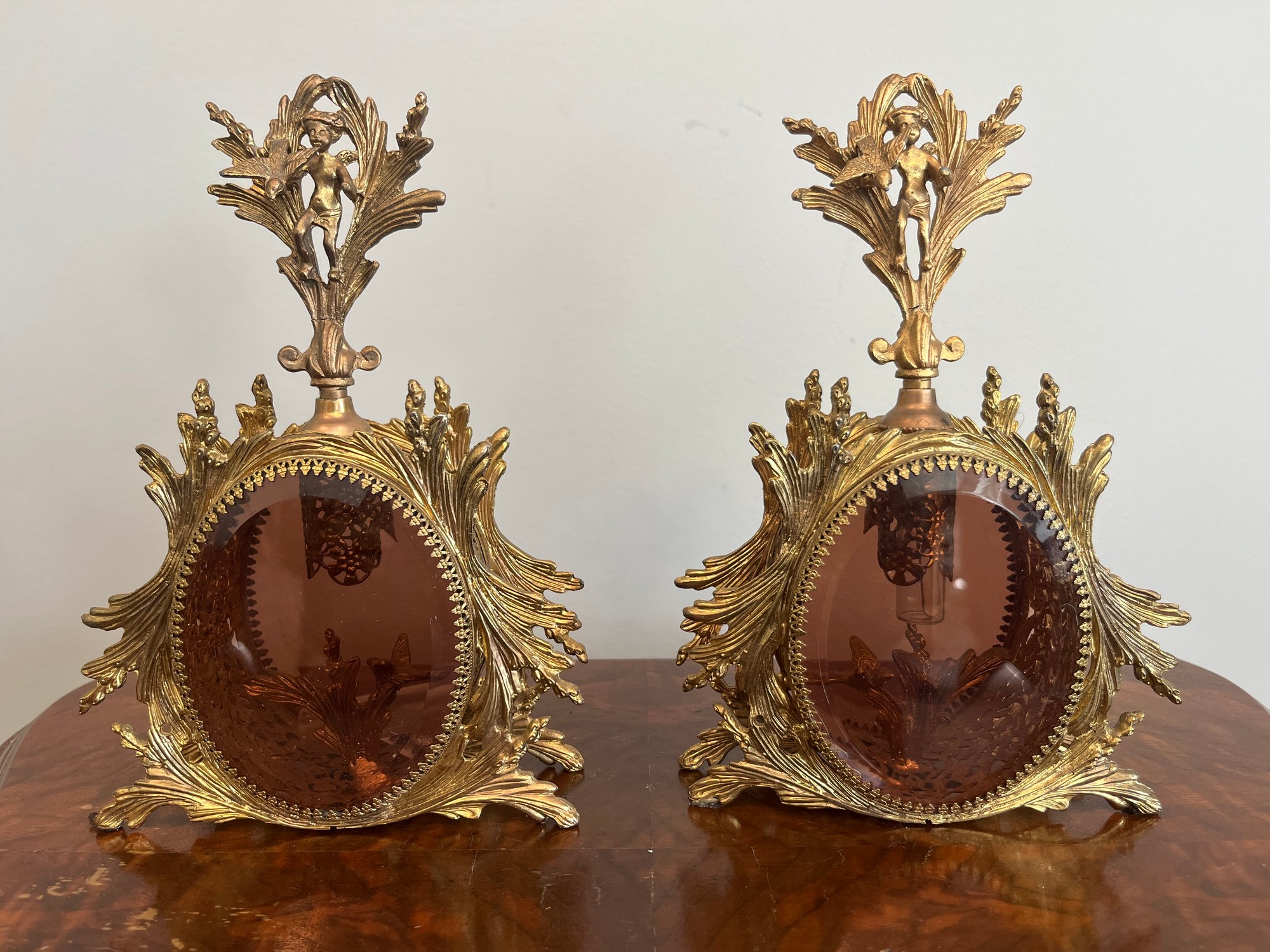 Ormolu gold filigree perfume bottle with an amber glass containers. It features an angel cherub holding a bird at the top. The bottle is made of amber glass and has intricate gold filigree detailing. It is vintage, possibly from the Hollywood Regency era. Please know one of the glass perfume containers has become dislodged, but still wonderful display pieces or could be repaired.