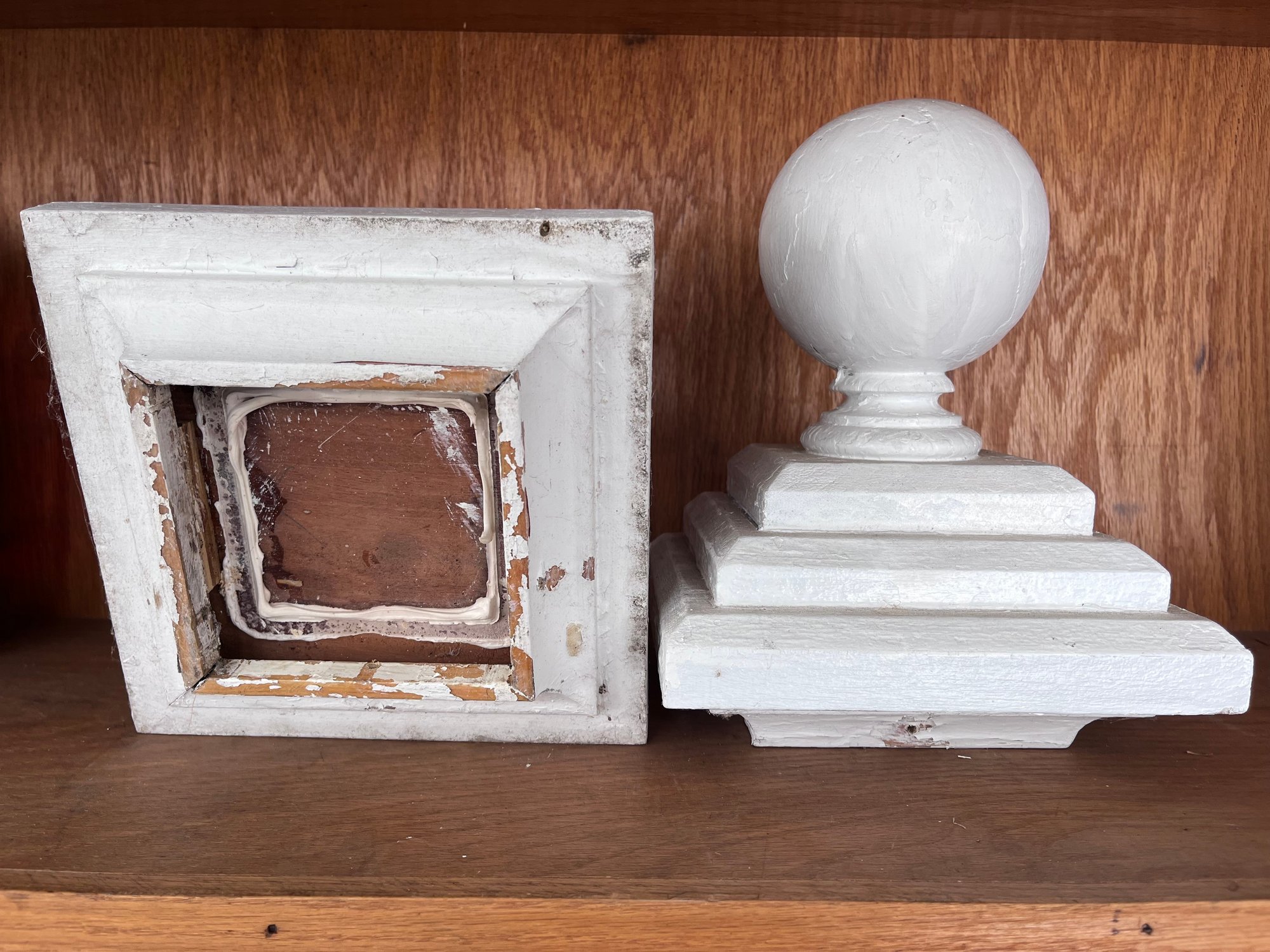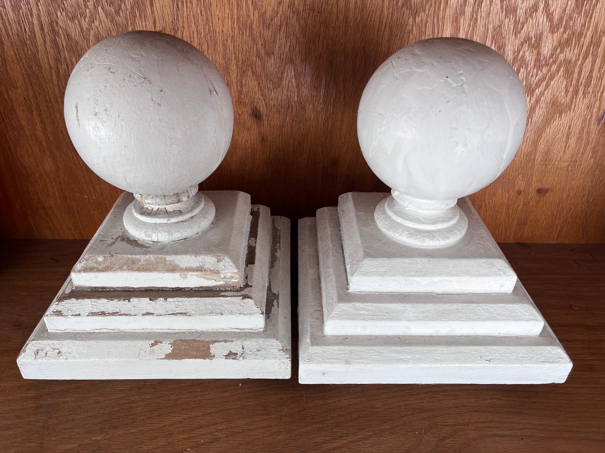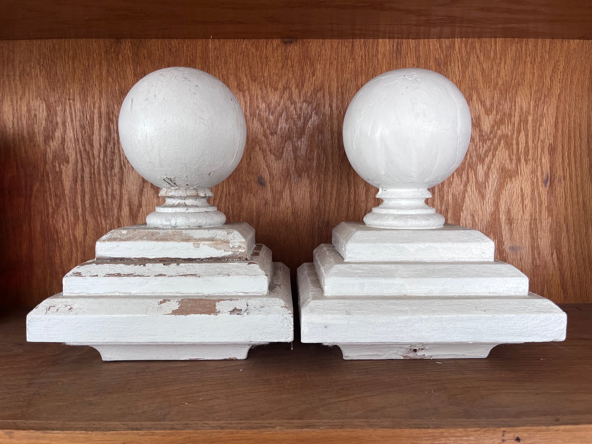 Pair of vintage architectural finials, designed to be decorative end pieces for posts or newel posts. They are made of wood and have a white painted finish that is heavily distressed, suggesting age or outdoor use.