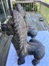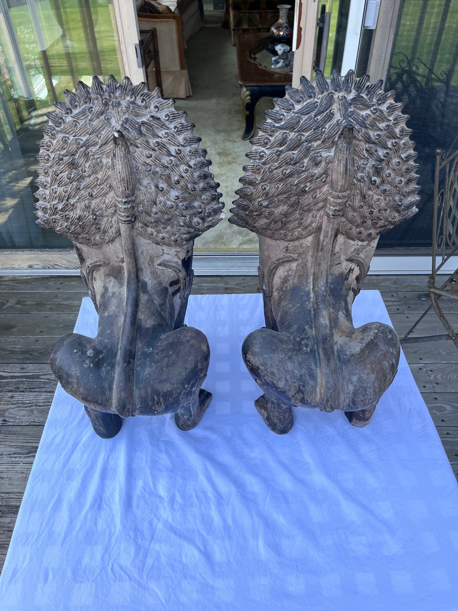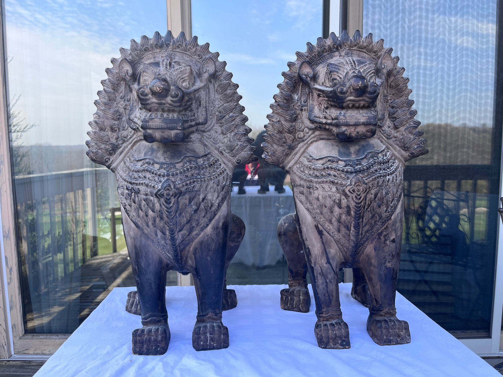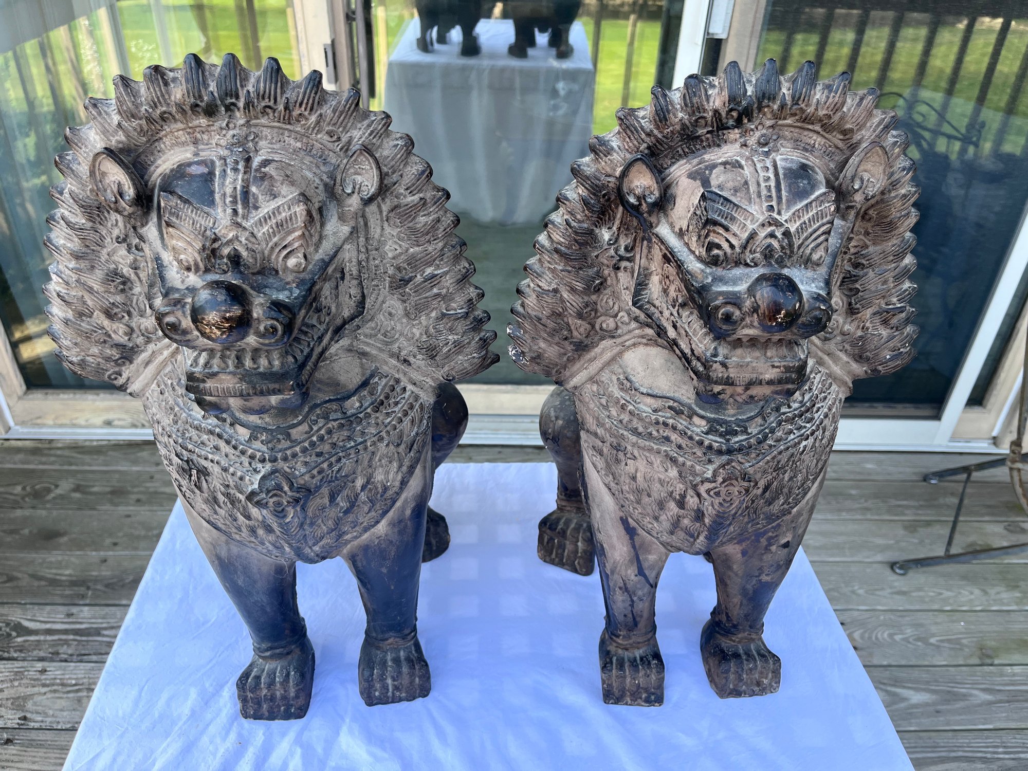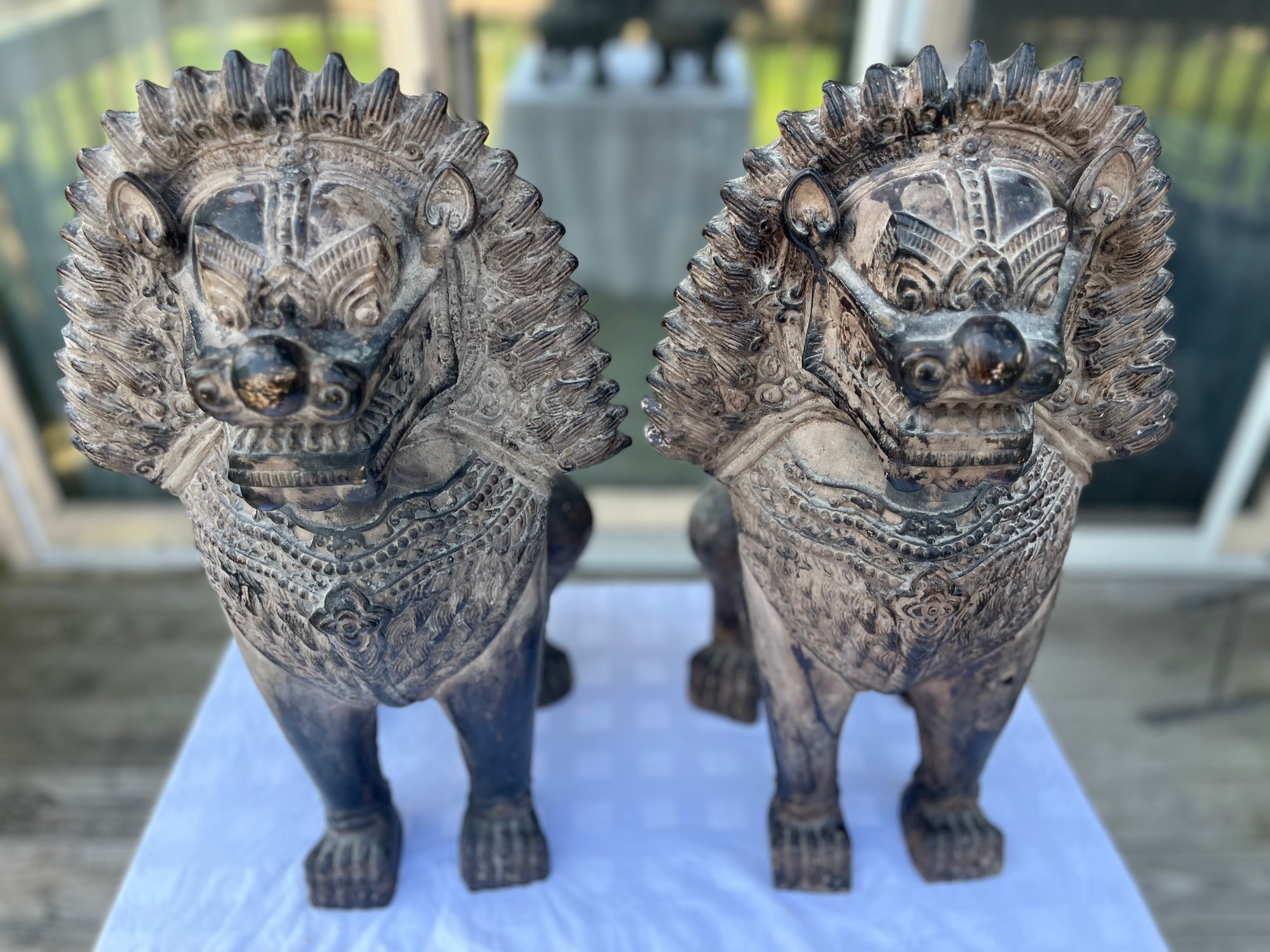 These make an impressive statement flanking an entryway, fireplace, garden gate, patio, bookshelf, or interior console table. Nicely weathered finish with aged patina that gives them a carved stone / antique temple look.