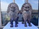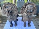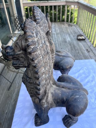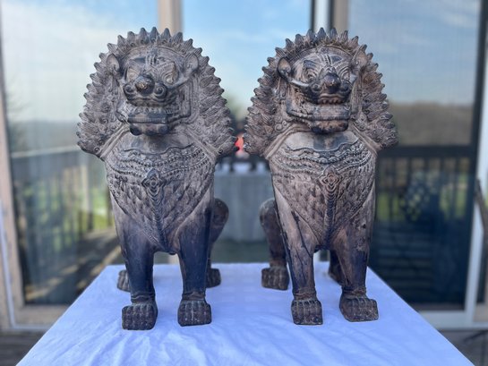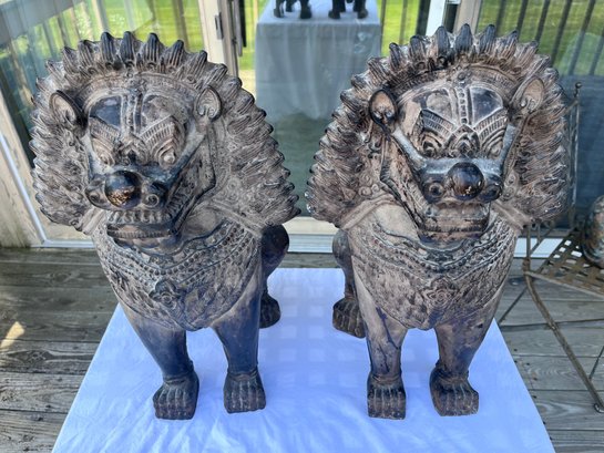 Striking vintage pair of Asian guardian lion / foo dog statues in Balinese or Southeast Asian inspired style. Highly detailed with dramatic carved manes, expressive faces, ornate chest decoration, and strong symmetrical presence.