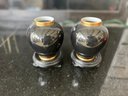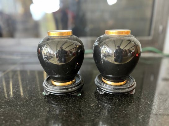 Elegant pair of vintage Fitz & Floyd porcelain bud vases from the Renaissance collection, dated 1987 and made in Japan. These feature a glossy black finish with rich gold trim at the rim and base, giving them a classic Hollywood Regency / traditional décor style.