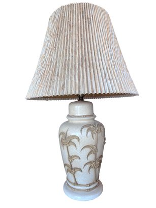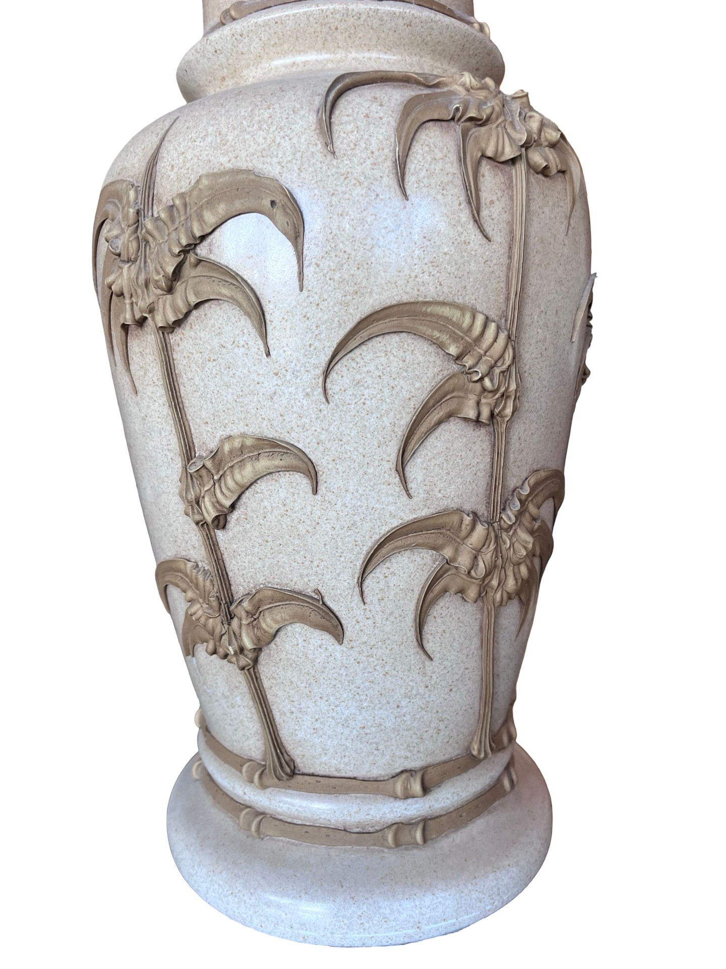 Beautiful matched pair of oversized vintage ceramic table lamps featuring raised tropical palm tree motif with textured neutral glaze bodies. Elegant sculptural design with substantial presence, perfect for coastal, Palm Beach, Hollywood Regency, or transitional interiors.