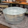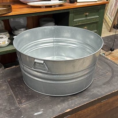 Galvanized metal bucket. Big size, has handles. Good for storage, plants, or just cool decor.