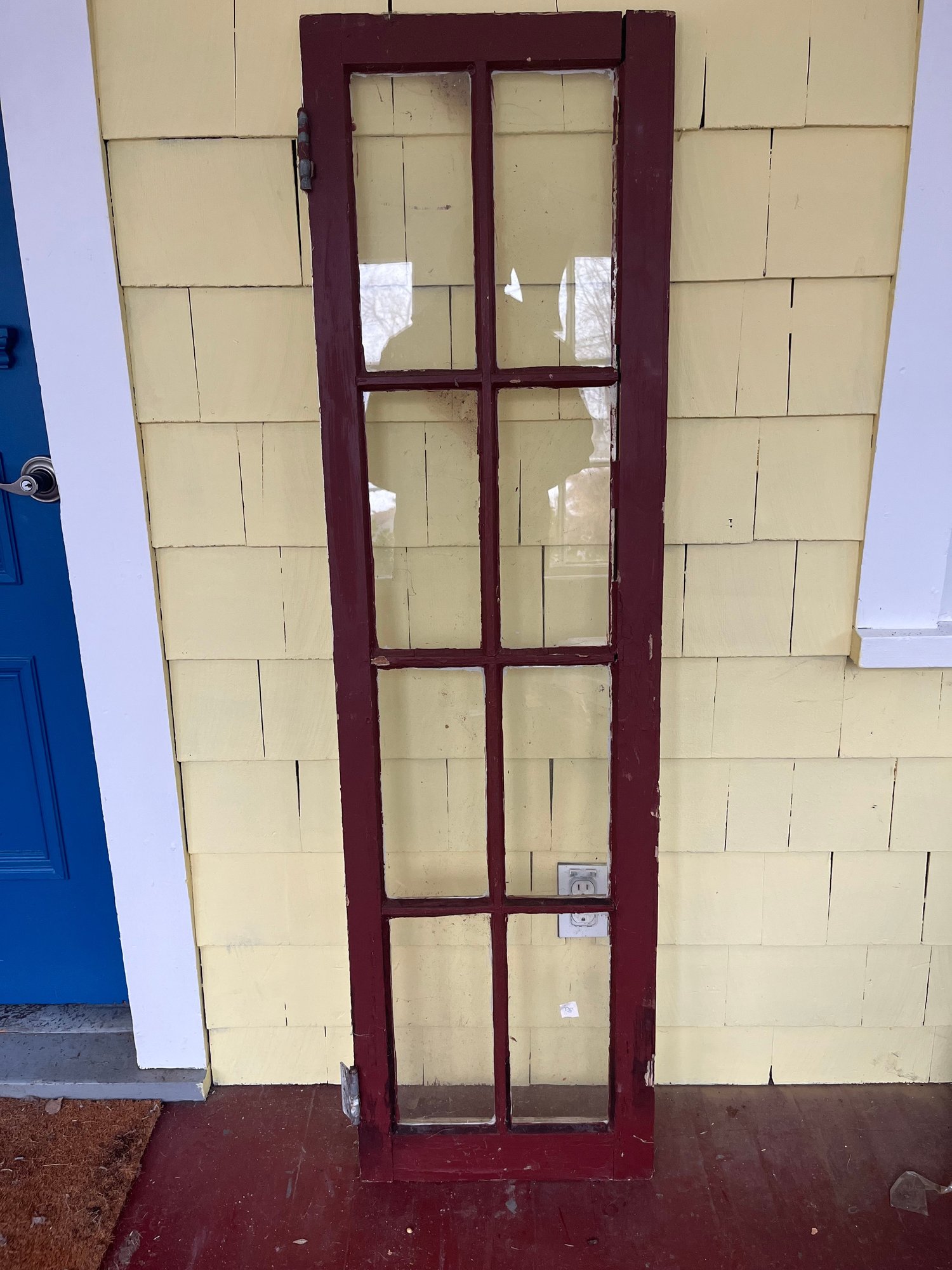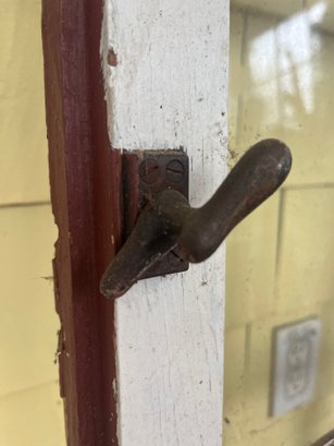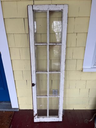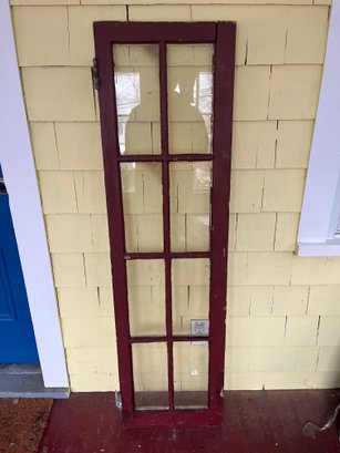 Antique 8-lite wooden casement window, featuring a red-painted frame and eight individual panes of glass.