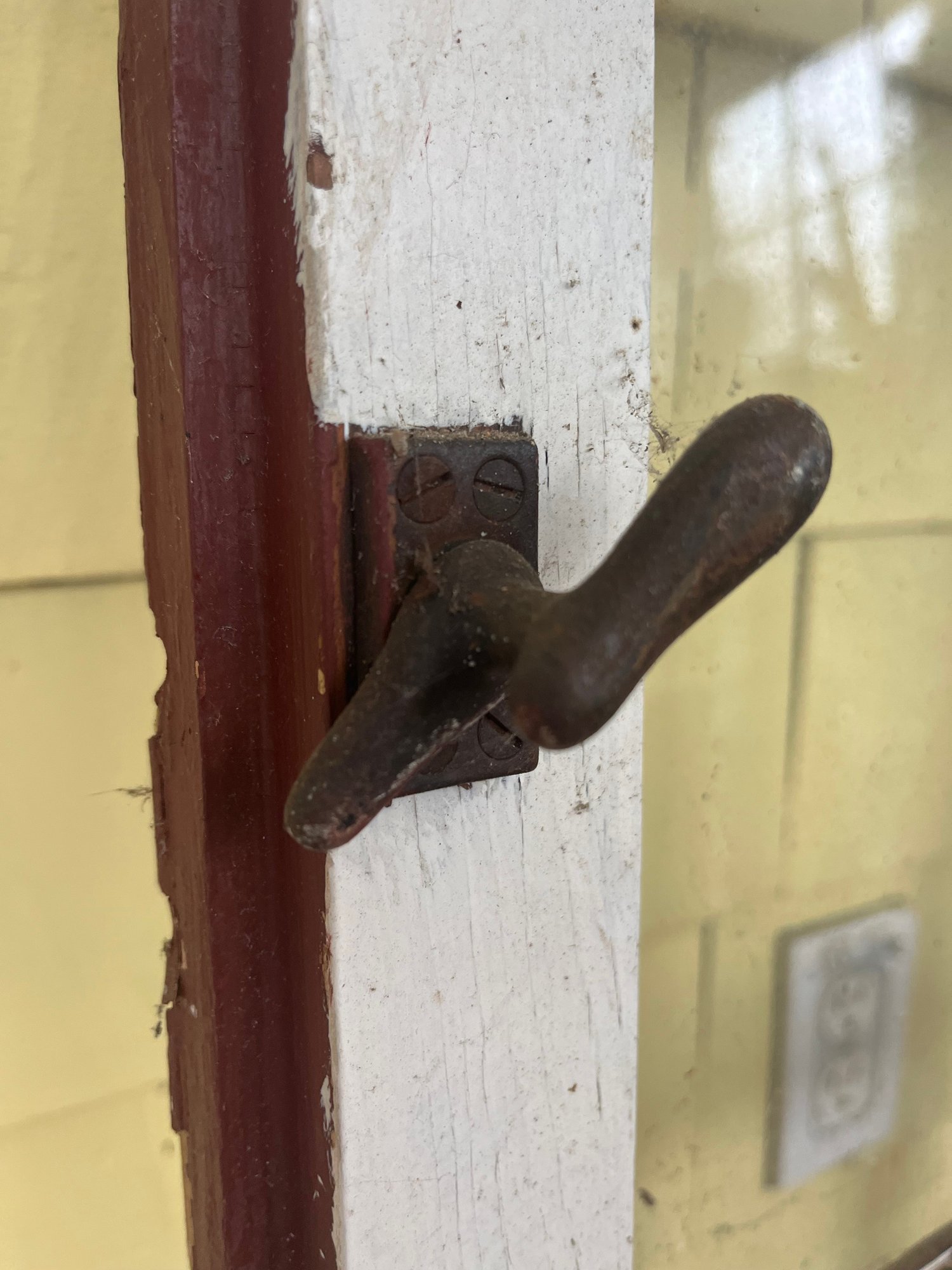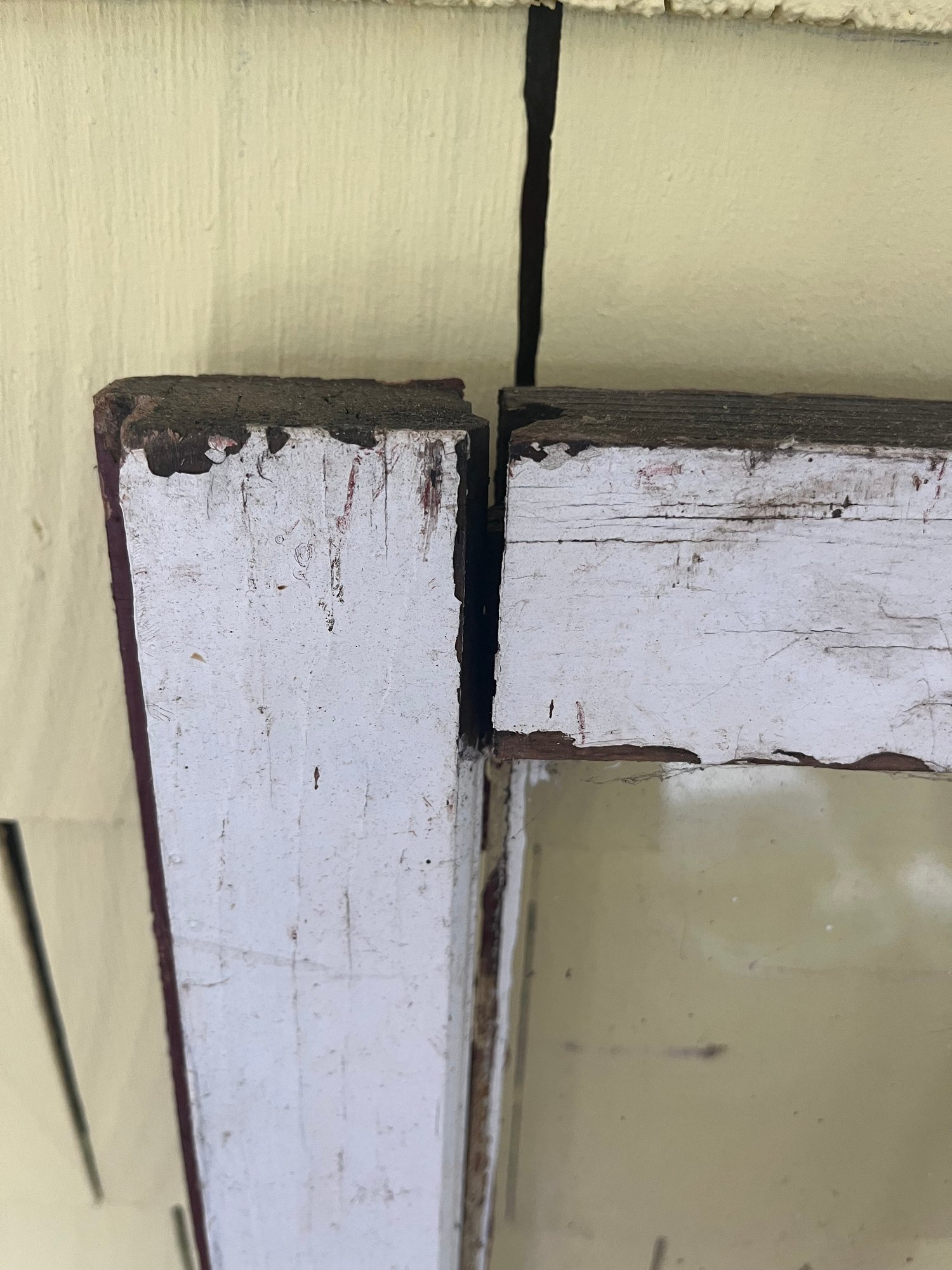 Has worn, peeling paint, which is consistent with its age. All of the glass is intact and does not have any chips or cracks.