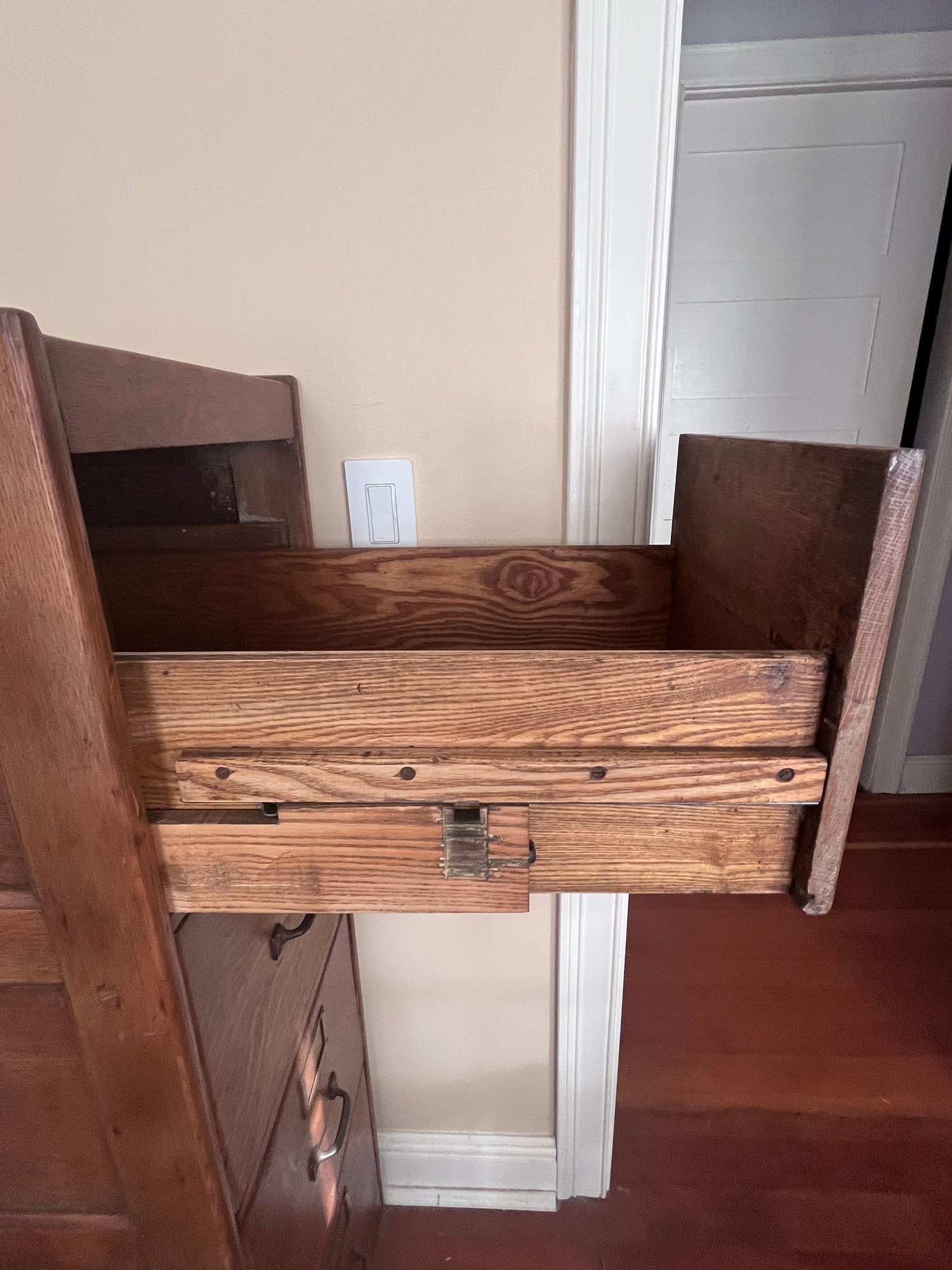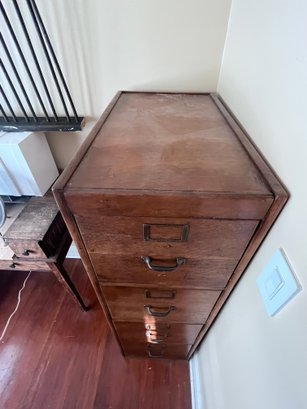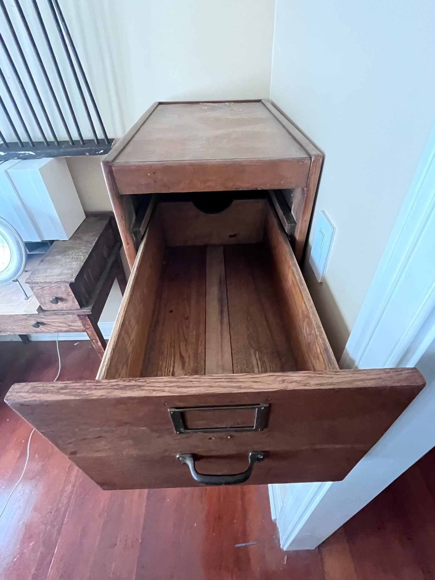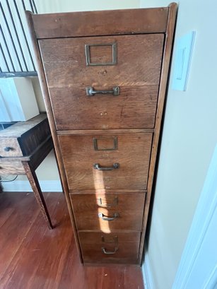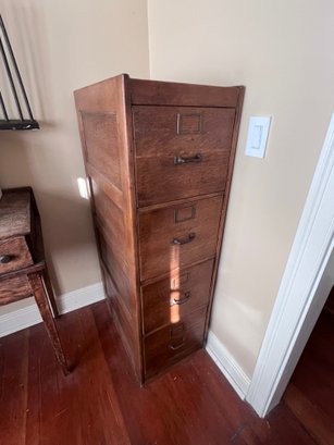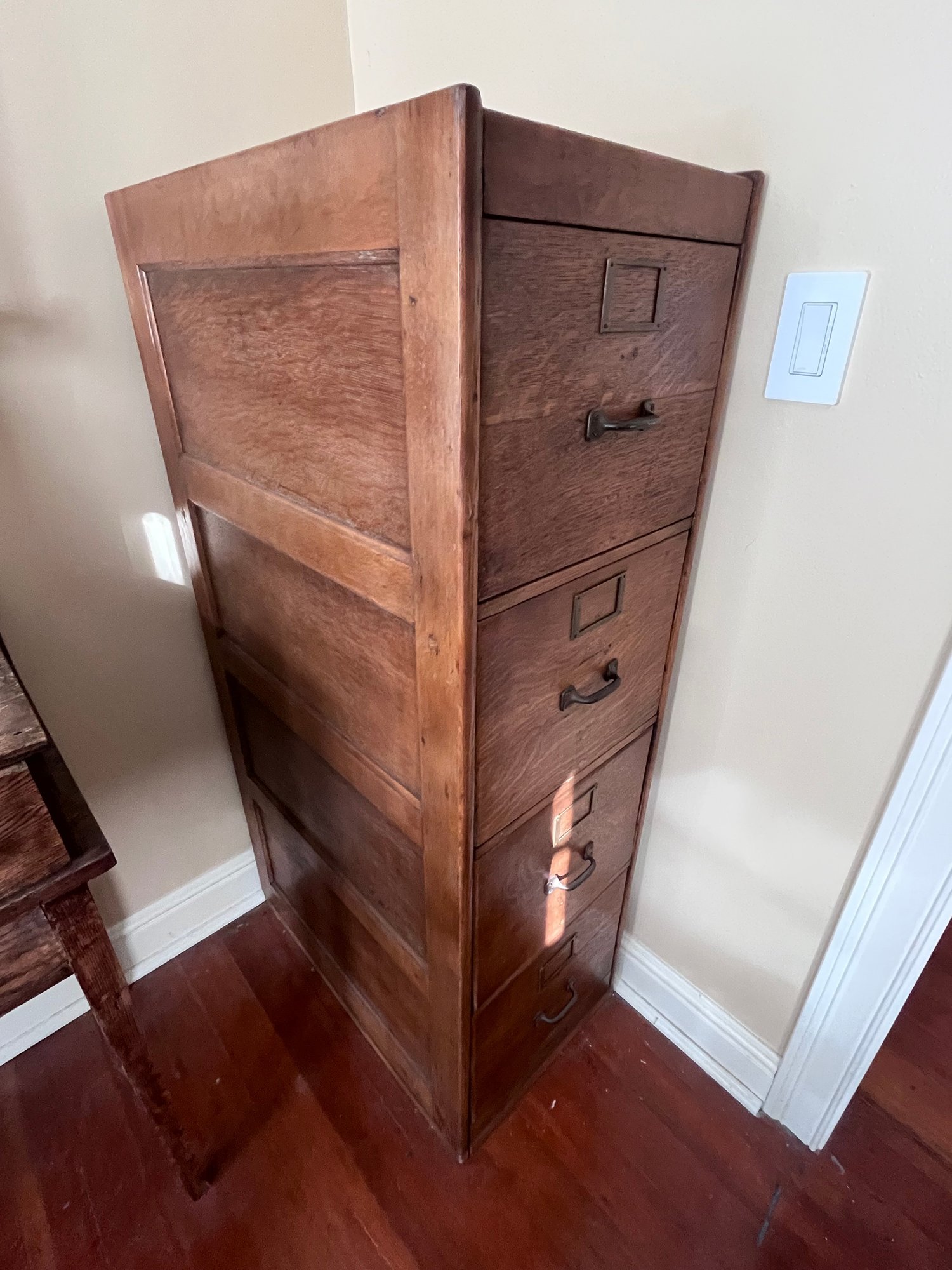 Antique American four-drawer oak file cabinet, likely dating to the early 20th century.