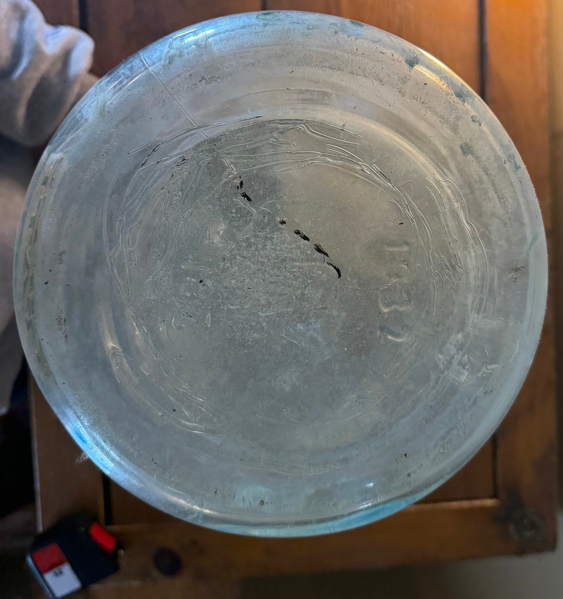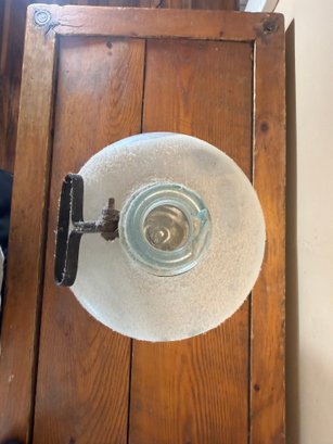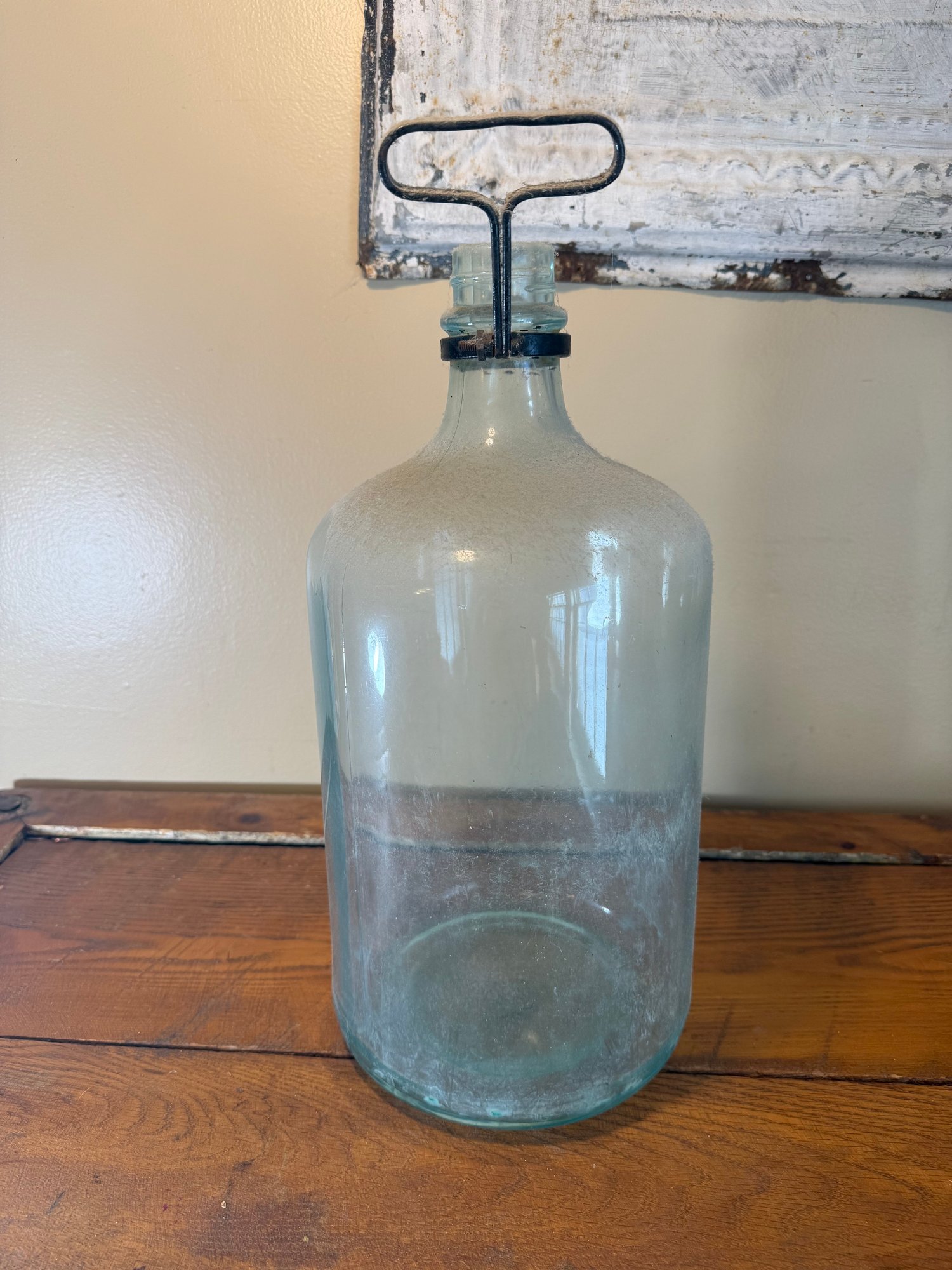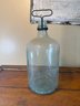 A large, vintage glass jug, likely dating from the early to mid-1900s. The glass has a beautiful pale sea-green or aqua blue tint. It features a distinctive two-seam construction and a unique metal T-shaped handle/closure mechanism around the neck.