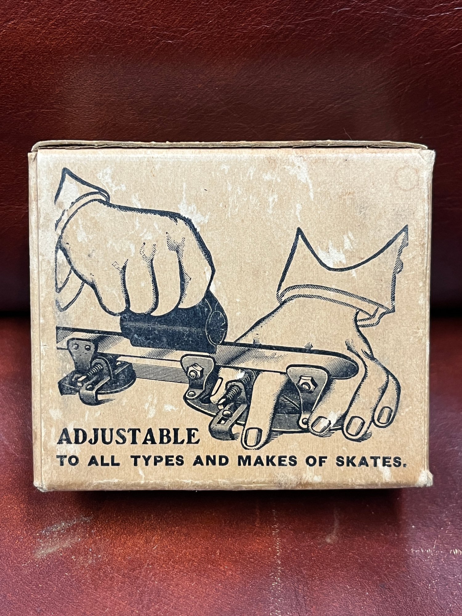 The item is a vintage Berghman Skate Sharpener in its original box, dating back to the 1920s. It is an abrasive tool designed for sharpening all types and makes of ice skates. Key details include: