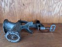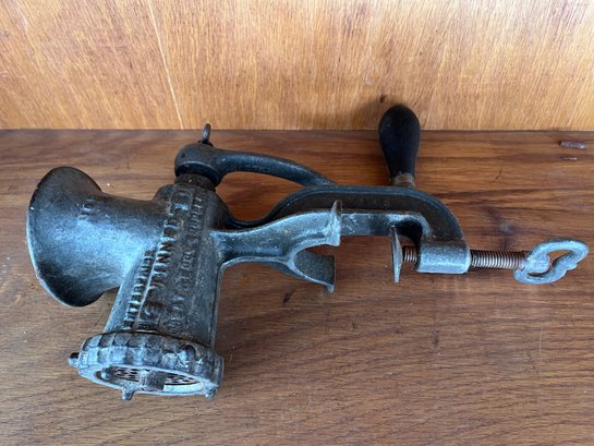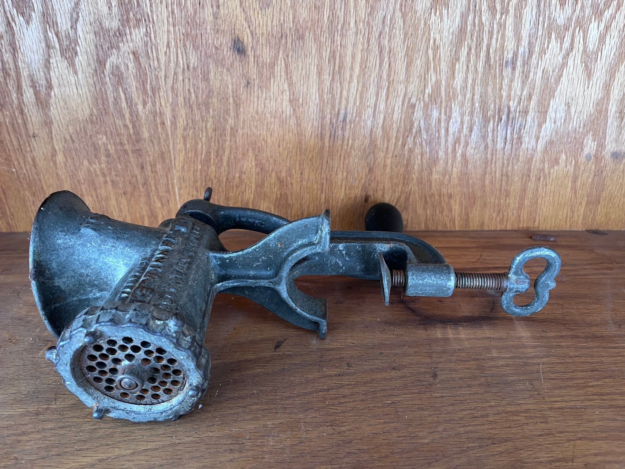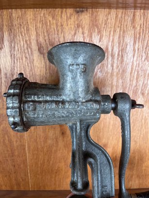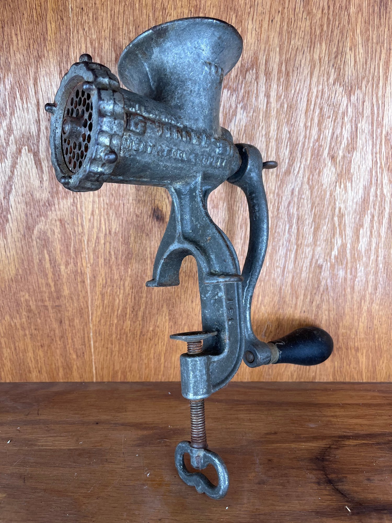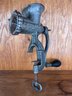 Antique cast iron hand-crank meat grinder, Enterprise model No. 5 , used for chopping meat and other foods.
