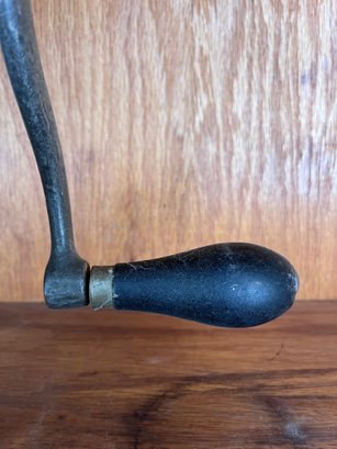 It has a hand crank with a wooden handle to operate the internal grinding mechanism.