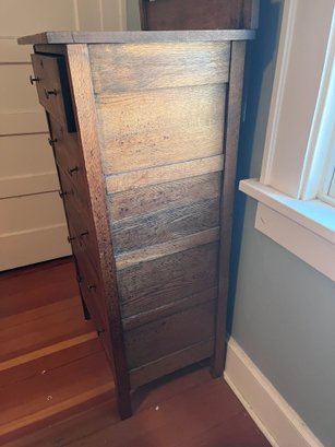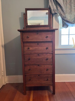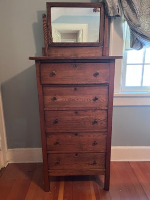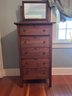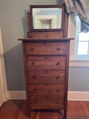 The piece is classified as a tallboy or highboy dresser due to its vertical orientation.