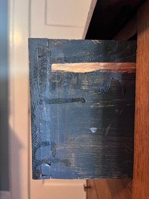 It features five drawers of varying sizes, each with simple wooden knobs and keyhole locks.