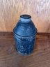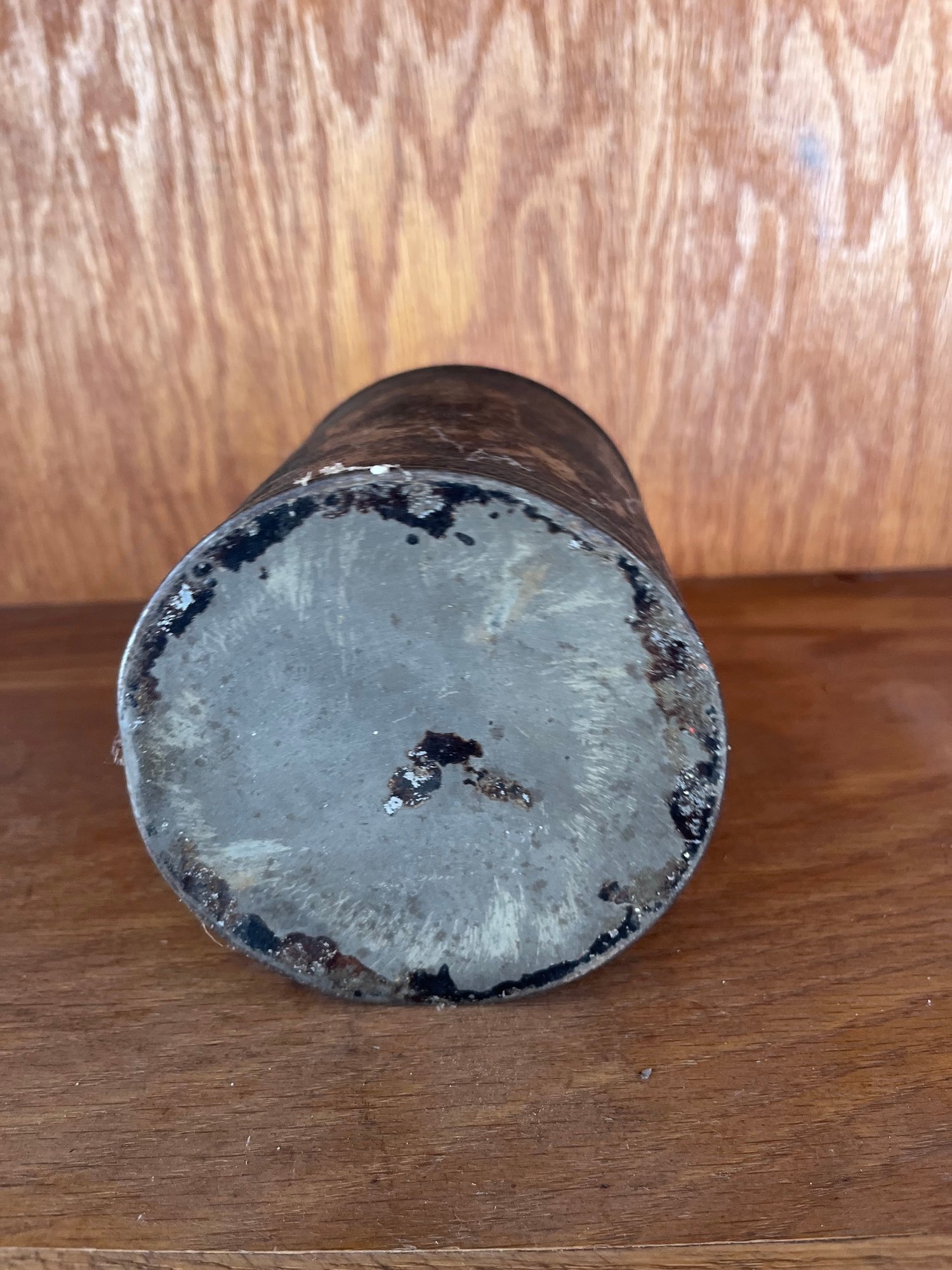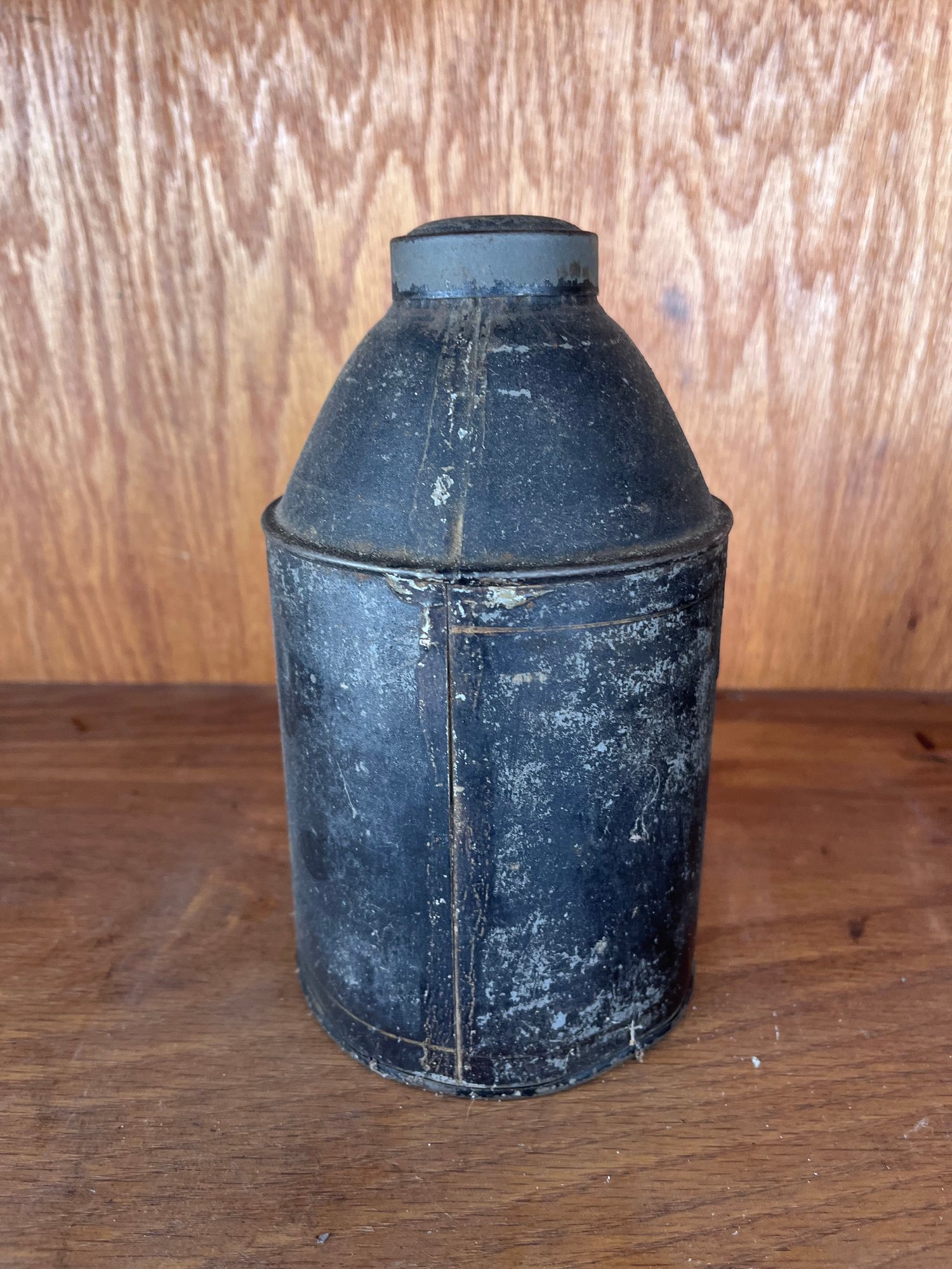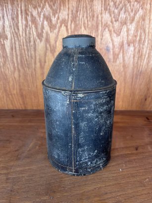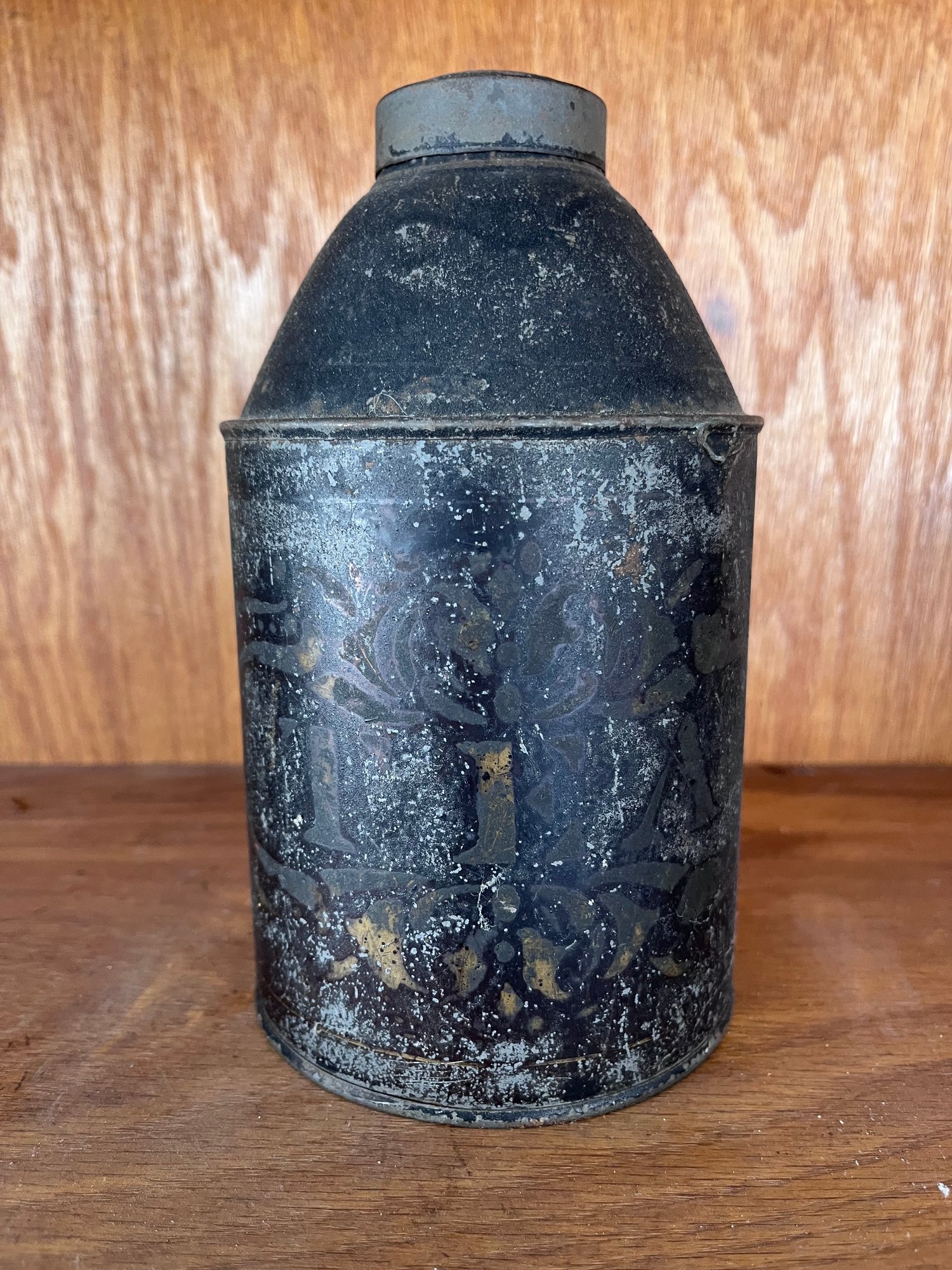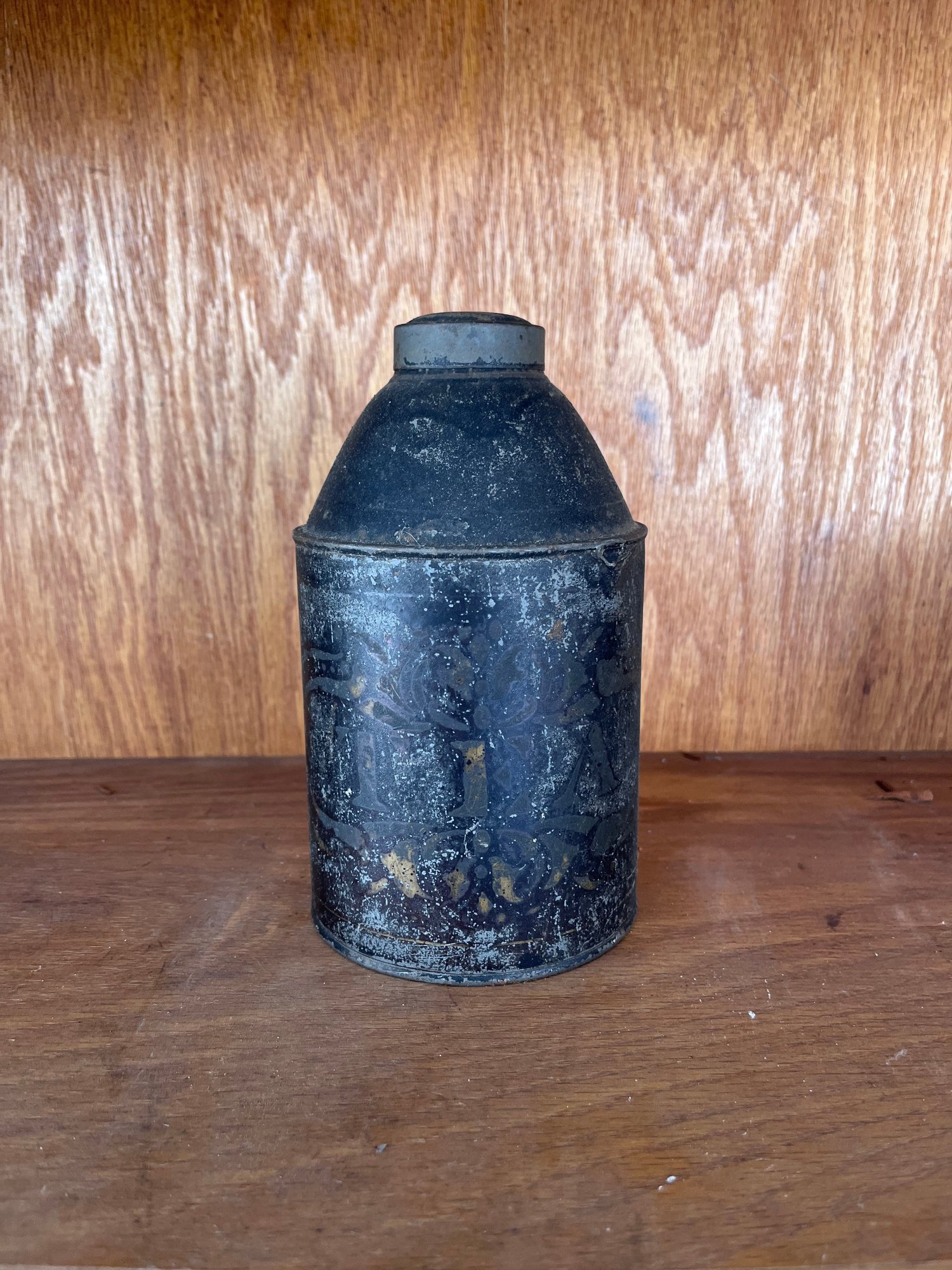 Antique painted tin canister or caddy, likely used for storing items like tea or coffee.