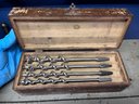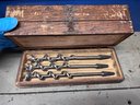 Bits appear clean with sharp spurs and solid threads. Box shows heavy honest age/use wear including scratches, finish loss, scuffs, stains, and patina to hardware. Label has fading/wear but remains presentable. Great display piece, collectible tool set, or usable vintage brace bit set.