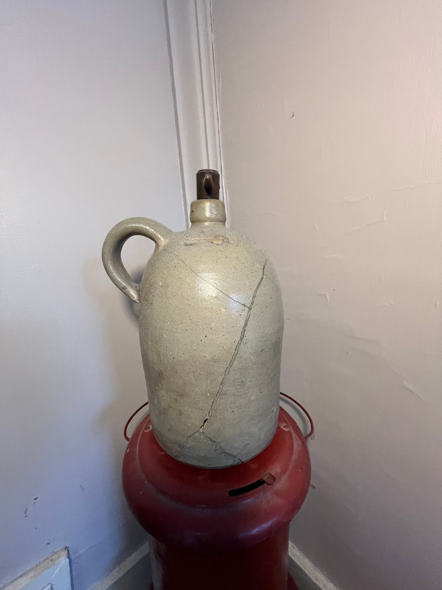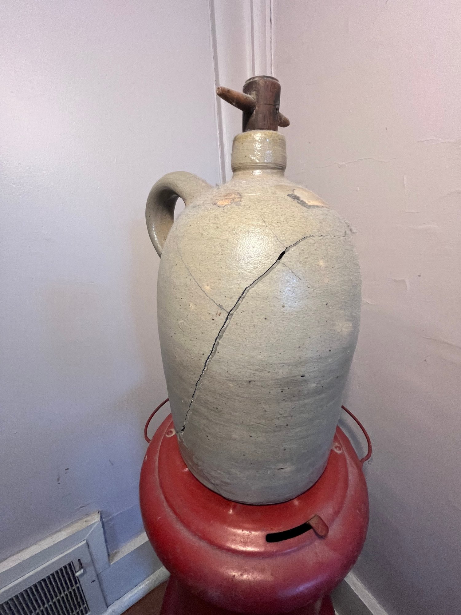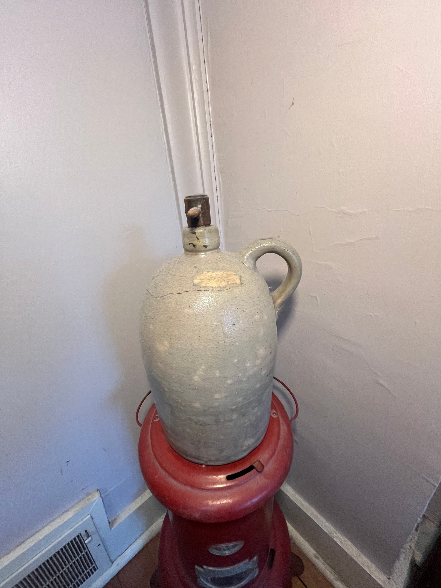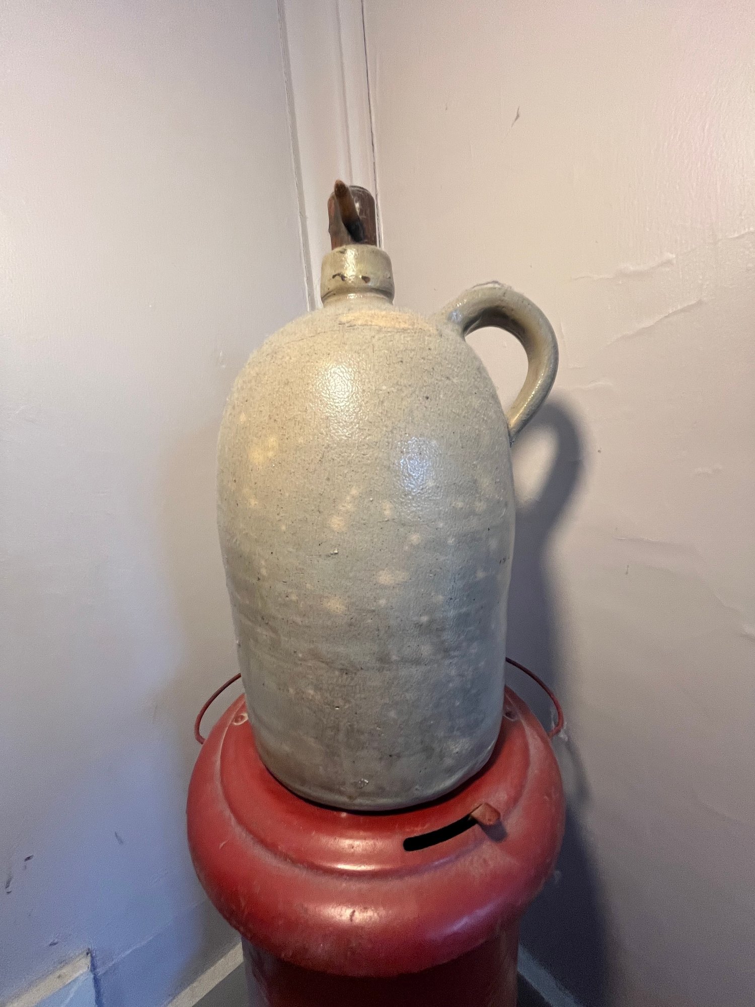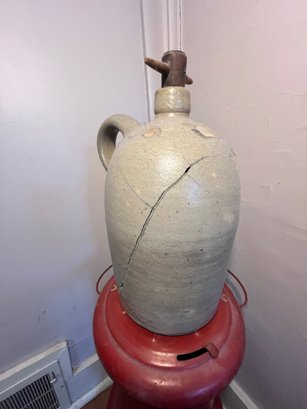 Features: The presence of the spigot suggests it was likely used as a dispenser or a small still at some point.