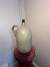 Antique salt-glazed stoneware jug, possibly dating from the 19th or early 20th century. These jugs were often used for storing liquids like whiskey, vinegar, or molasses.