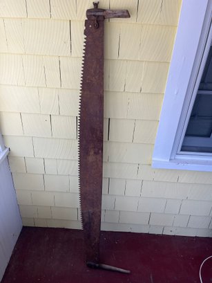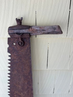 Antique two-man crosscut saw, often referred to as a "lumberjack saw" or "wide belly saw".