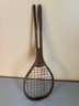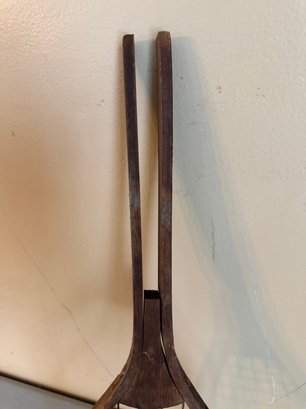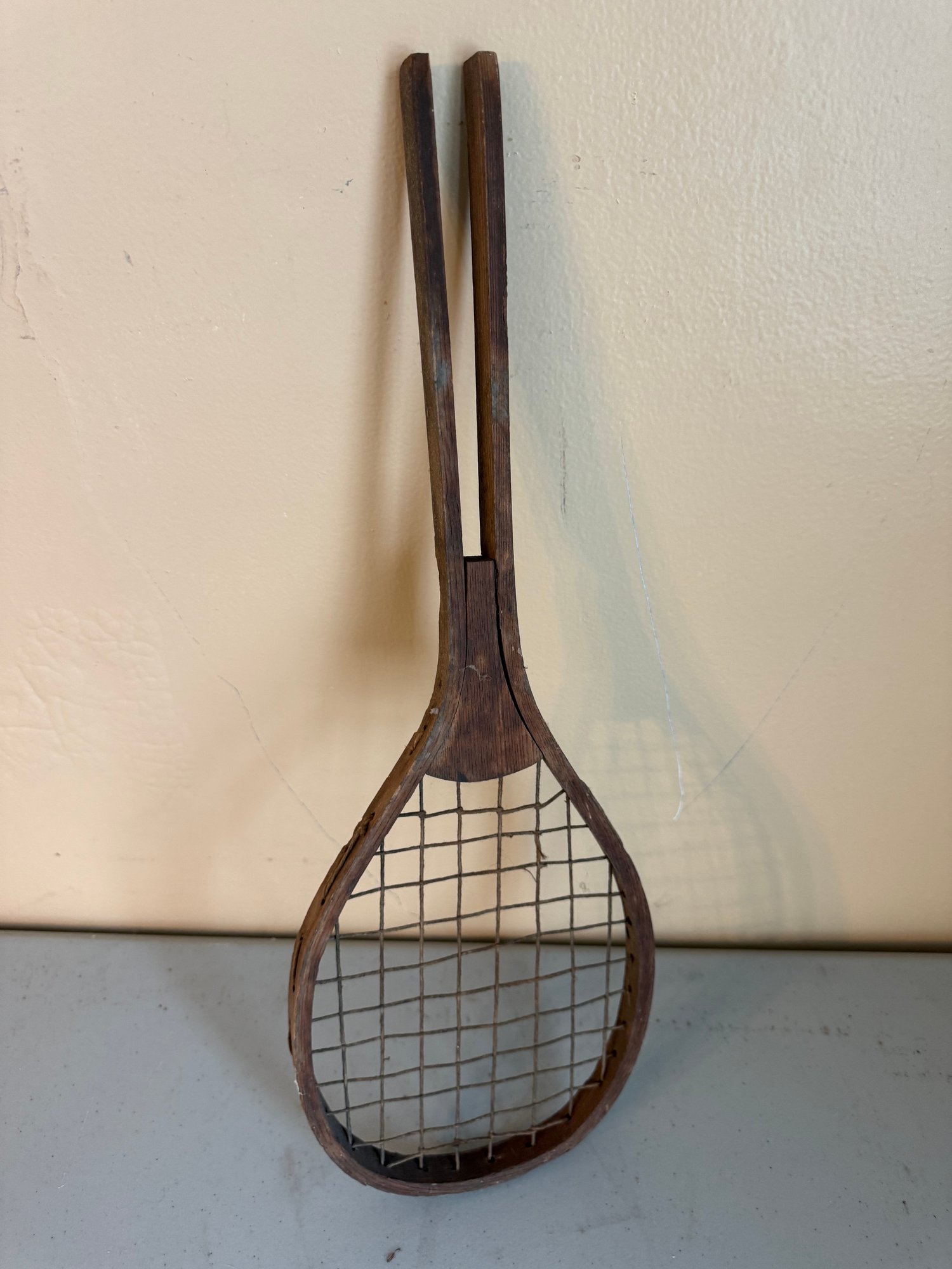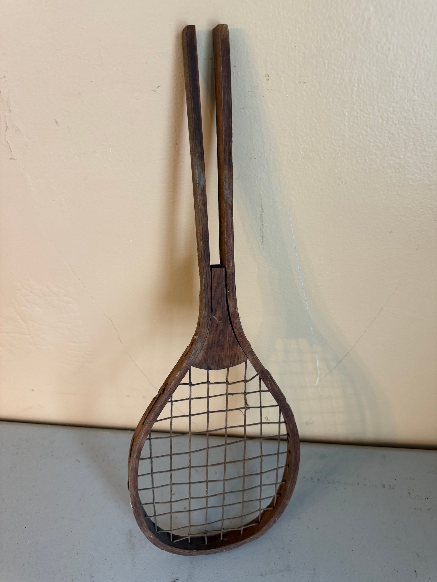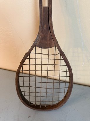 Antique wooden tennis racket 6 3/4 inches wide and 19 1/2 inches long.