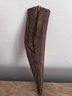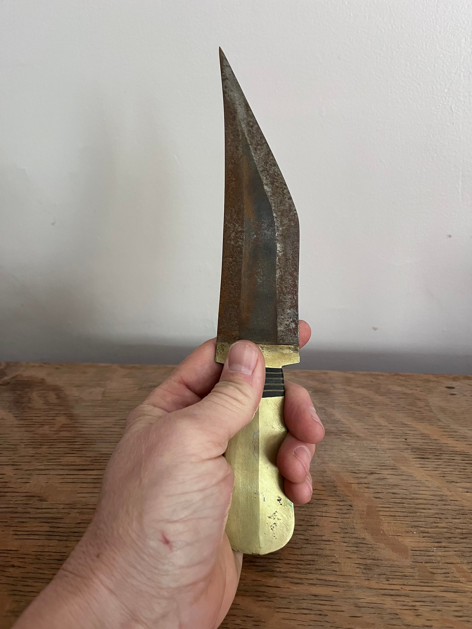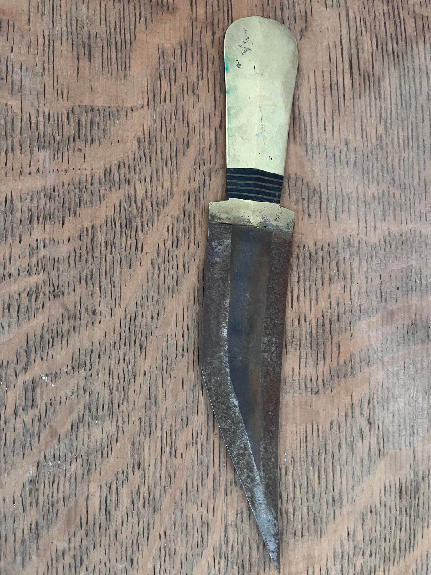 Appears to be a vintage or antique fixed blade knife, possibly a type of ethnic or ceremonial dagger, featuring a brass handle and a highly rusted iron or steel blade. The simple design and construction suggest it may be a hand-forged piece.