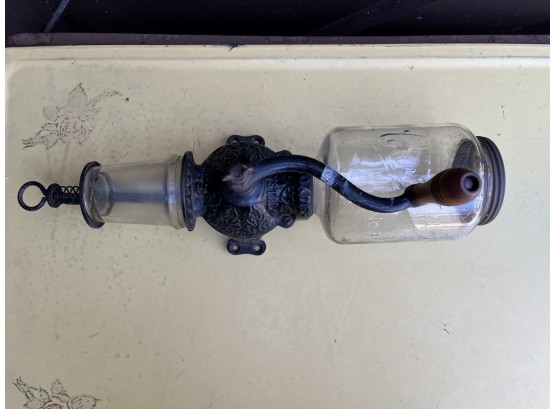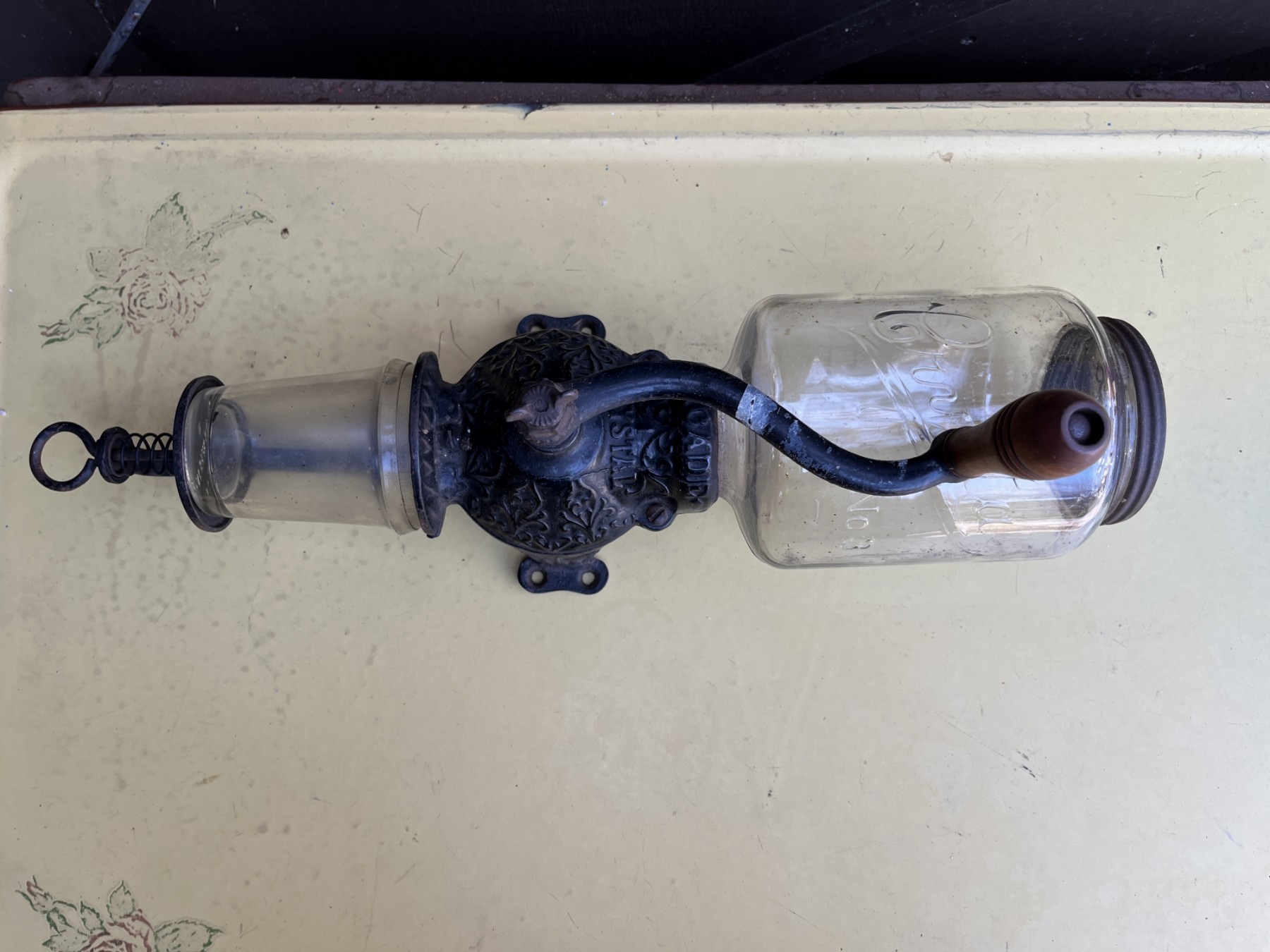Rare Antique Arcade Crystal Coffee Grinder No 3 Cast Iron With Lid And Catch Cup. I do not think that the catch cup is original. However it fits it well.